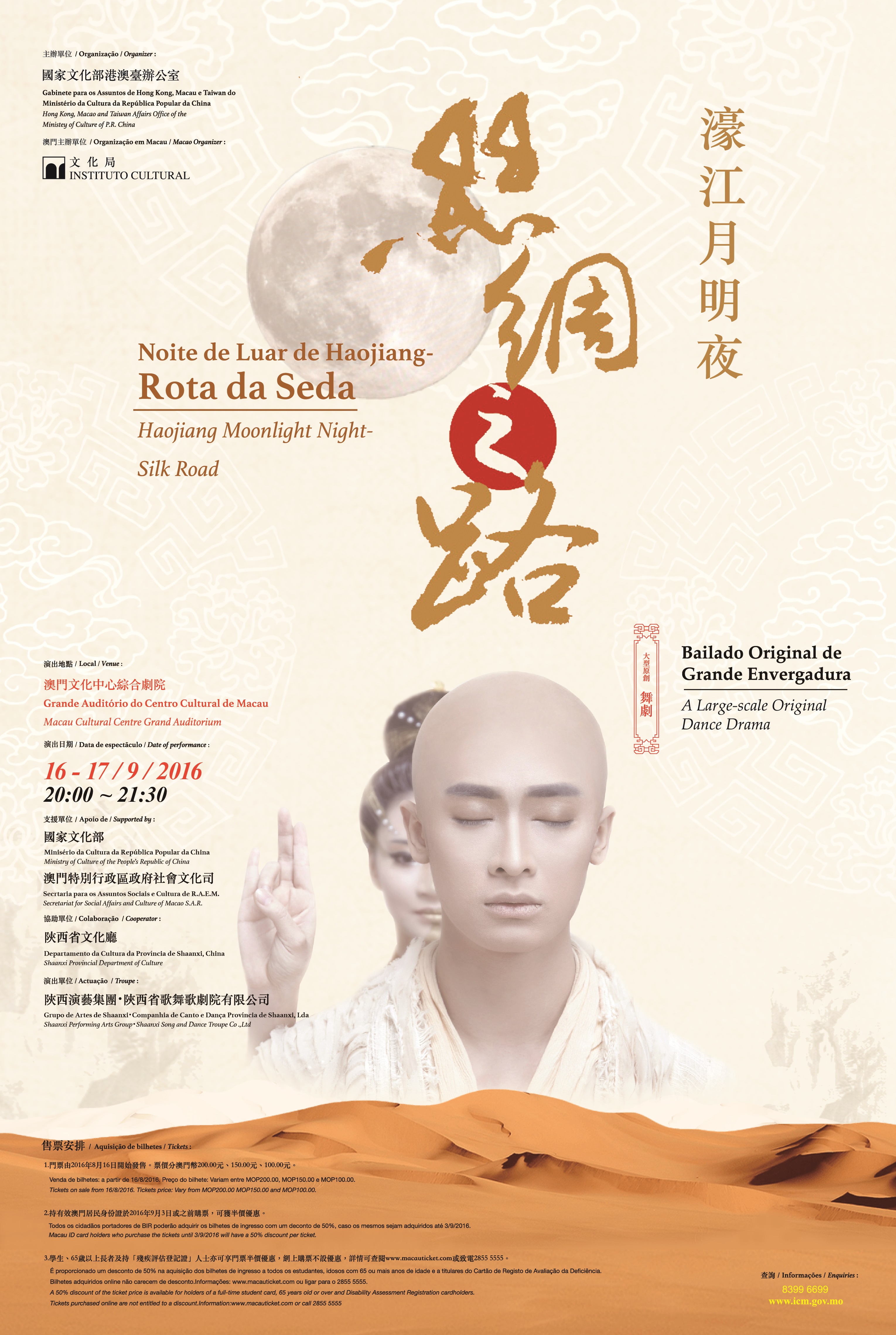 Os bilhetes para o bailado original de grande escala Noite de Luar de Haojiang – Rota da Seda encontram-se à venda aos preços de MOP200, 150 e 100, estando disponíveis vários planos de descontos. Os portadores de Bilhete de Identidade de Residente válido gozam de um desconto de 50% na compra de bilhetes até 3 de Setembro; descontos também de 50% na compra em qualquer período para estudantes, idosos com 65 anos de idade ou acima e titulares do Cartão de Registo de Avaliação da Deficiência. Estes descontos não estão disponíveis para compras online. Linha directa de reserva de bilhetes: 2855 5555. Para mais informações e detalhes sobre o programa é favor vsistar a página electrónica do Instituto Cultural em www.icm.gov.mo ou ligar para o IC através do telefone n.º 8399 6699 durante o horário de expediente.