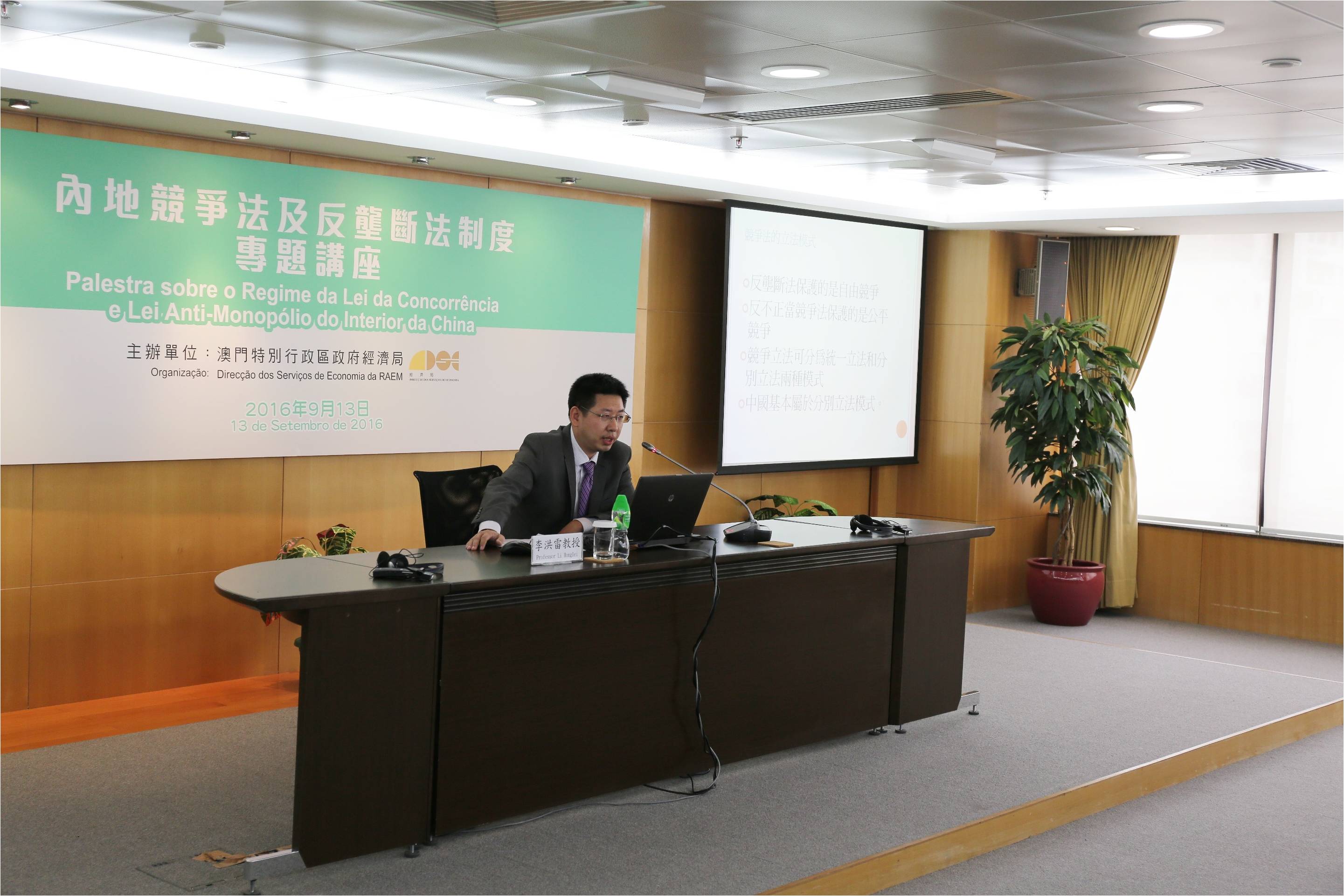 Para participar na Palestra, foram convidados dois académicos distintos, considerados autoridades do Interior da China na área da Lei da Concorrência e da Lei Anti-Monopólio, o Professor Wang Xiaoye, Doutor em Direito pela Universidade de Hamburgo, Alemanha, Investigador do Instituto de Estudos de Direito da Academia de Ciências Sociais da China, e o Dr. Li Honglei, Coordenador do Instituto de Direito Constitucional e Direito Administrativo da Academia de Ciências Sociais da China, que procederam à apresentação de vários temas relacionados com a Lei Anti-Monopólio do Interior da China, nomeadamente elaboração e aplicação, problemas enfrentados na sua aplicação e perspectivas do seu aperfeiçoamento, bem como mecanismos, medidas e resultados da implementação da lei da concorrência, perspectivas de evolução futura, entre outros. O Professor Wang Xiaoye considerou que a Lei Anti-Monopólio do Interior da China já se tornou uma das leis anti-monopólio com mais impacto no mundo, graças à reforma do sistema económico da China, a Lei Anti-Monopólio tem cada vez um papel mais importante no sistema jurídico da China. O Dr. Li Honglei referiu que a Lei da Concorrência do Interior da China se encontra, de momento, a ser revista, visando reforçar a Lei e harmonizar-se com outras legislações.