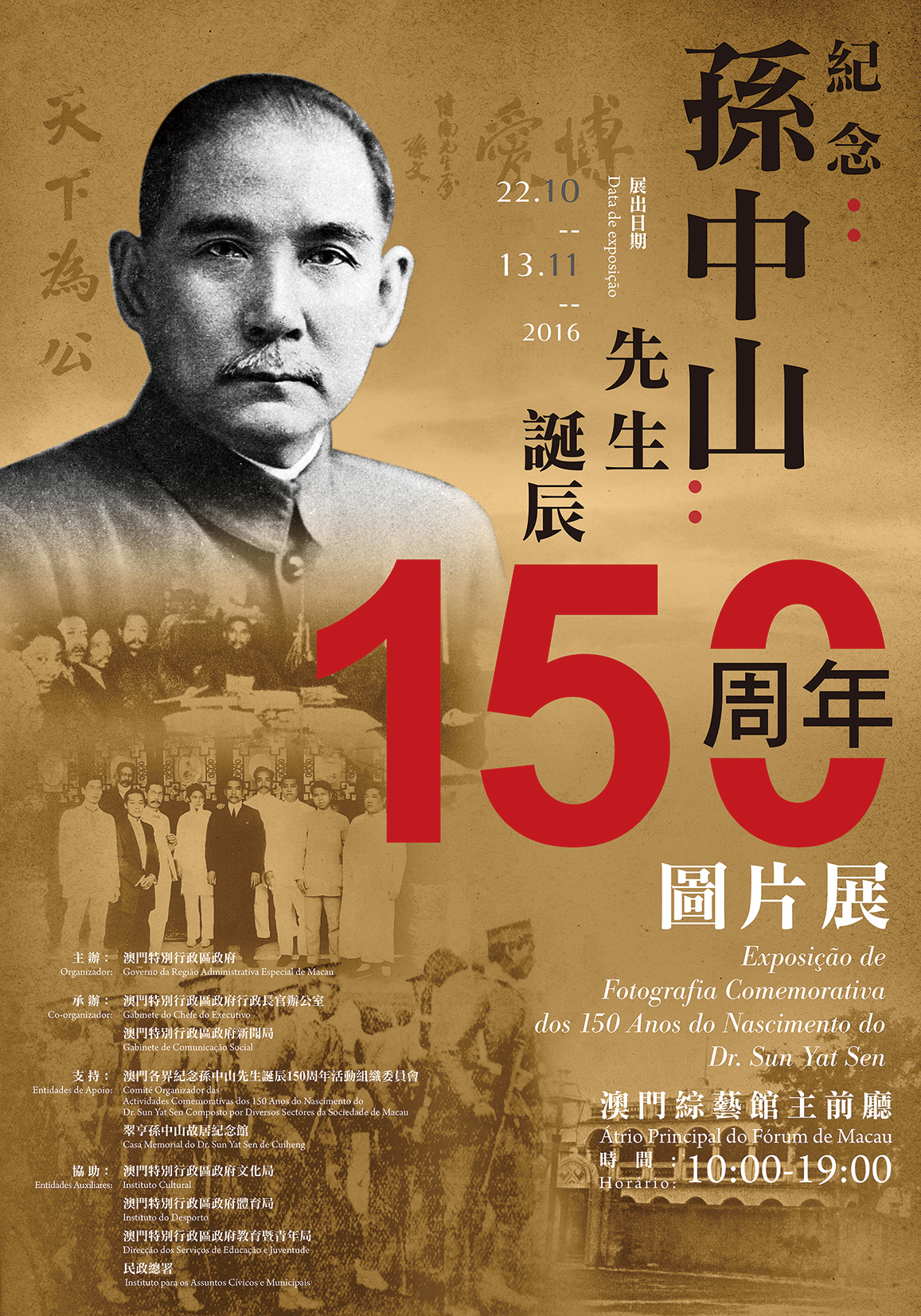 Para comemorar o 150º aniversário do Dr. Sun Yat Sen e aprofundar o conhecimento da sociedade sobre a história da sua vida e relações com Macau, o governo da Região Administrativa Especial de Macau realiza, de 22 de Outubro a 13 de Novembro, uma « Exposição de Fotografia Comemorativa dos 150 Anos do Nascimento do Dr. Sun Yat Sen ».
