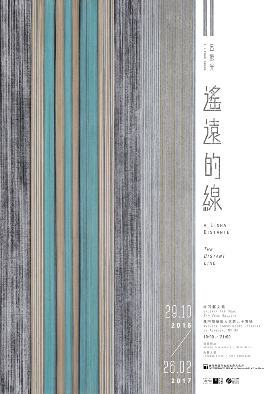 O Instituto Cultural (IC) irá realizar a exposição “Lui Chun Kwong A Linha Distante” na Galeria Tap Seac, exibindo 31 obras/séries do artista famoso de Hong, Kong Lui Chun Kwong. A cerimónia de inauguração da exposição será realizada no dia 28 de Outubro (Sexta-feira), pelas 18:30 horas.