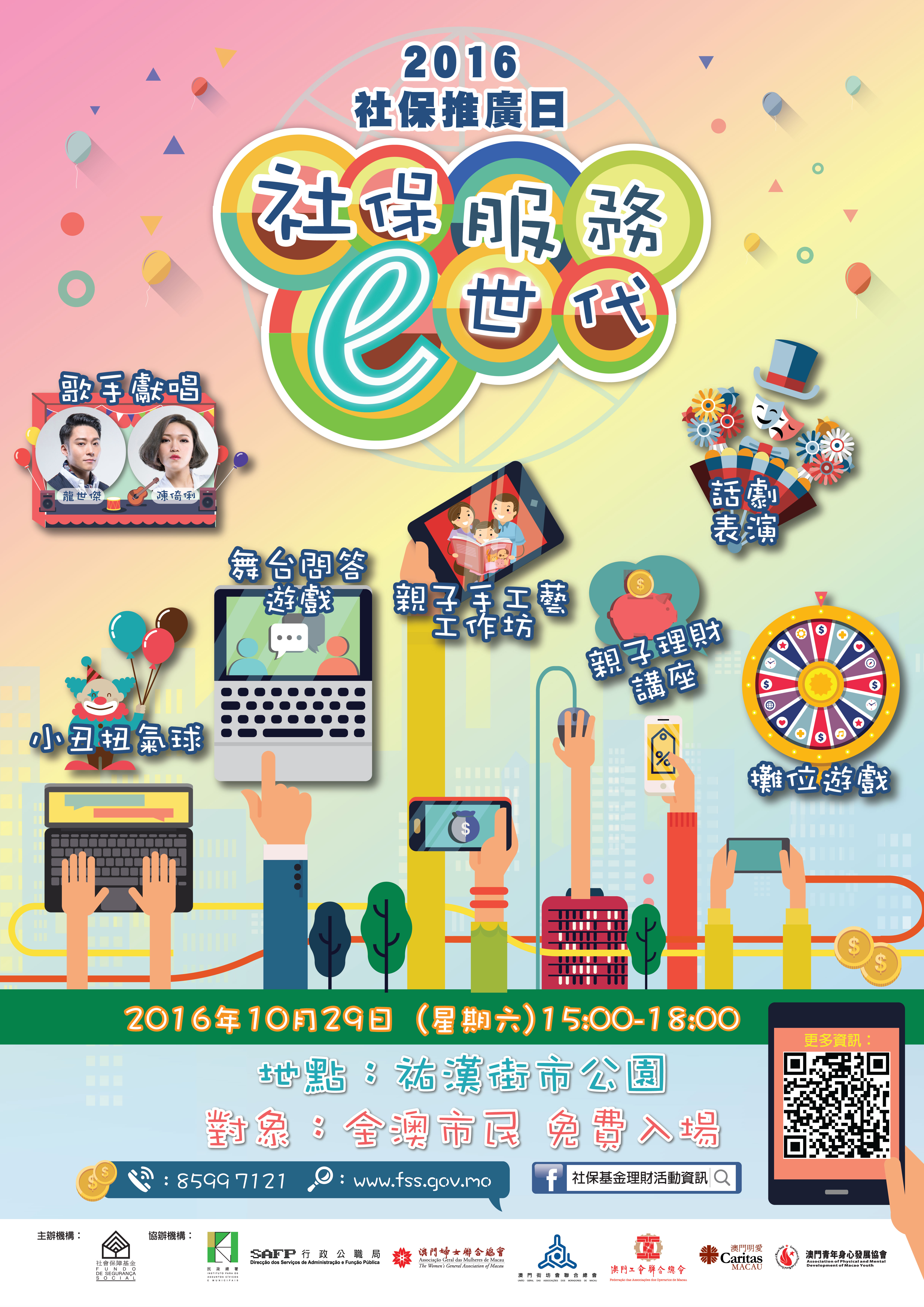 A actividade “Dia de promoção do regime da segurança social”, organizada pelo Fundo de Segurança Social (FSS) vai ter lugar no Sábado (dia 29), das 15H00 às 18H00, no Jardim do Mercado Municipal de Iao Hon, o tema do presente ano é “Serviços do FSS na época electrónica”. Mostram-se os serviços electrónicos do FSS, através de exposição temática, jogos de tendas e experimentação, etc. Durante a actividade, haverá uma palestra sobre a gestão financeira para os pais e filhos, oficina de artesanato, e diversas apresentações, com vista a transmitir aos cidadãos o conceito de gestão financeira e informações do regime da segurança social.