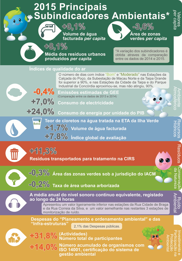 No que respeita ao ambiente atmosférico, a percentagem do número total de dias em que o ar foi “Bom” ou “Moderado” em 2015, medido nas estações de monitorização da qualidade do ar, foi aproximadamente de 90%. Pela primeira vez, o valor médio anual de concentração de PM10 e PM2,5 foi inferior aos valores padrão, o que corresponde ao resultado obtido pela “Rede de monitorização da qualidade do ar da Região do Delta do Rio das Pérolas (Guangdong, Hong Kong e Macau)”. Todavia, as PM2,5 são continuadamente consideradas um dos principais poluentes que estão a afectar o índice de qualidade do ar de Macau. Em 2014 as emissões estimadas de alguns poluentes atmosféricos de Macau aumentaram e, face a 2013, houve uma redução nas emissões estimadas de gases com efeito de estufa. Em relação ao volume do consumo de água em 2015, o volume médio do consumo de água per capita registou um crescimento em comparação com 2014, enquanto o fornecimento e a qualidade da água potável mantiveram-se estáveis. Porém, a qualidade das águas costeiras piorou face a 2014. A quantidade de resíduos transportados para a Central de Incineração de Resíduos Sólidos de Macau em 2015 registou um crescimento de dois dígitos quando comparada com 2014, significando que os resíduos são uma questão prioritária no trabalho de protecção ambiental em Macau. Em relação à conservação da natureza, a taxa de zonas verdes urbanas de 2015 diminuiu ligeiramente face a 2014. No tocante ao ruído ambiental, embora o nível do ruído registado pelas estações de monitorização de ruído seja semelhante ao de 2014, o nível do ruído ambiental de Macau ainda esteve num nível elevado em termos globais. Quanto ao investimento e participação na protecção ambiental, o Governo manteve em 2015 um determinado investimento na área ambiental, tendo-se revelado um aumento tanto da preocupação e participação do público nas acções de protecção ambiental, como do número de empresas que obtiveram certificação de gestão ambiental, em comparação com 2014.