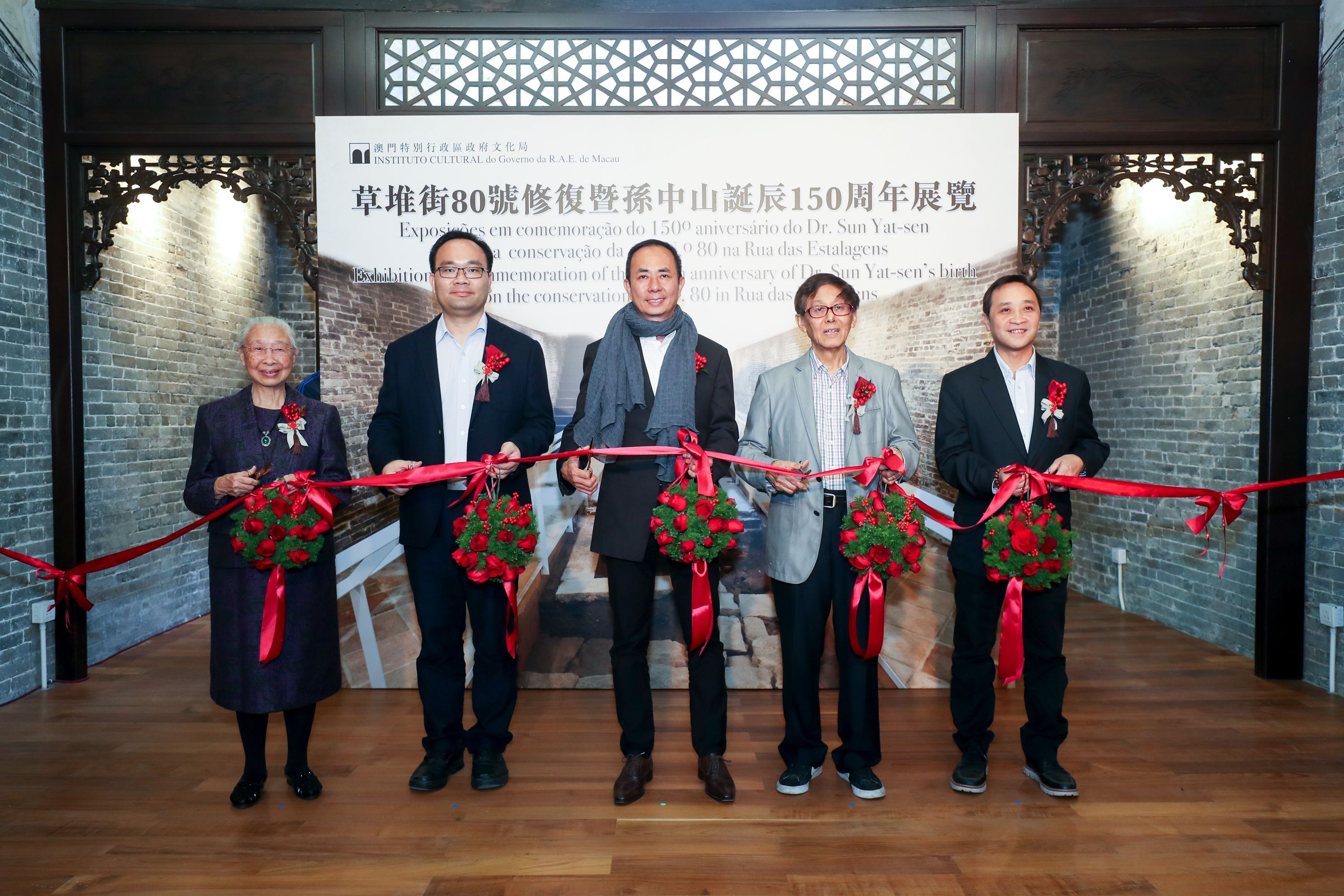 O Instituto Cultural (IC) realizou a cerimónia de inauguração da exposição “Exposições em comemoração do 150.o aniversário do Dr. Sun Yat-sen e sobre a conservação da casa N.o 80 na Rua das Estalagens” no dia 15 de Dezembro (Quinta-feira), pelas 15:30 horas, no Edifício do n.o 80 da Rua das Estalagens, a qual foi oficiada pelo Presidente do Instituto Cultural, Ung Vai Meng; o Curador do Museu de Dr. Sun Yat-sen da Vila Tsuiheng na cidade Zhongshan, Huang Jianmin; o Presidente da Associação de História de Macau, Chan Su Weng; a experiente educadora de Macau, Lau Sin Peng e Director da Associação de Beneficência e Assistência Mútua dos Moradores das 6 Ruas Chou Toi, Lo Teng Kam. Estiveram presentes os membros de Conselho do Património Cultural, especialistas e residentes, entre outros.