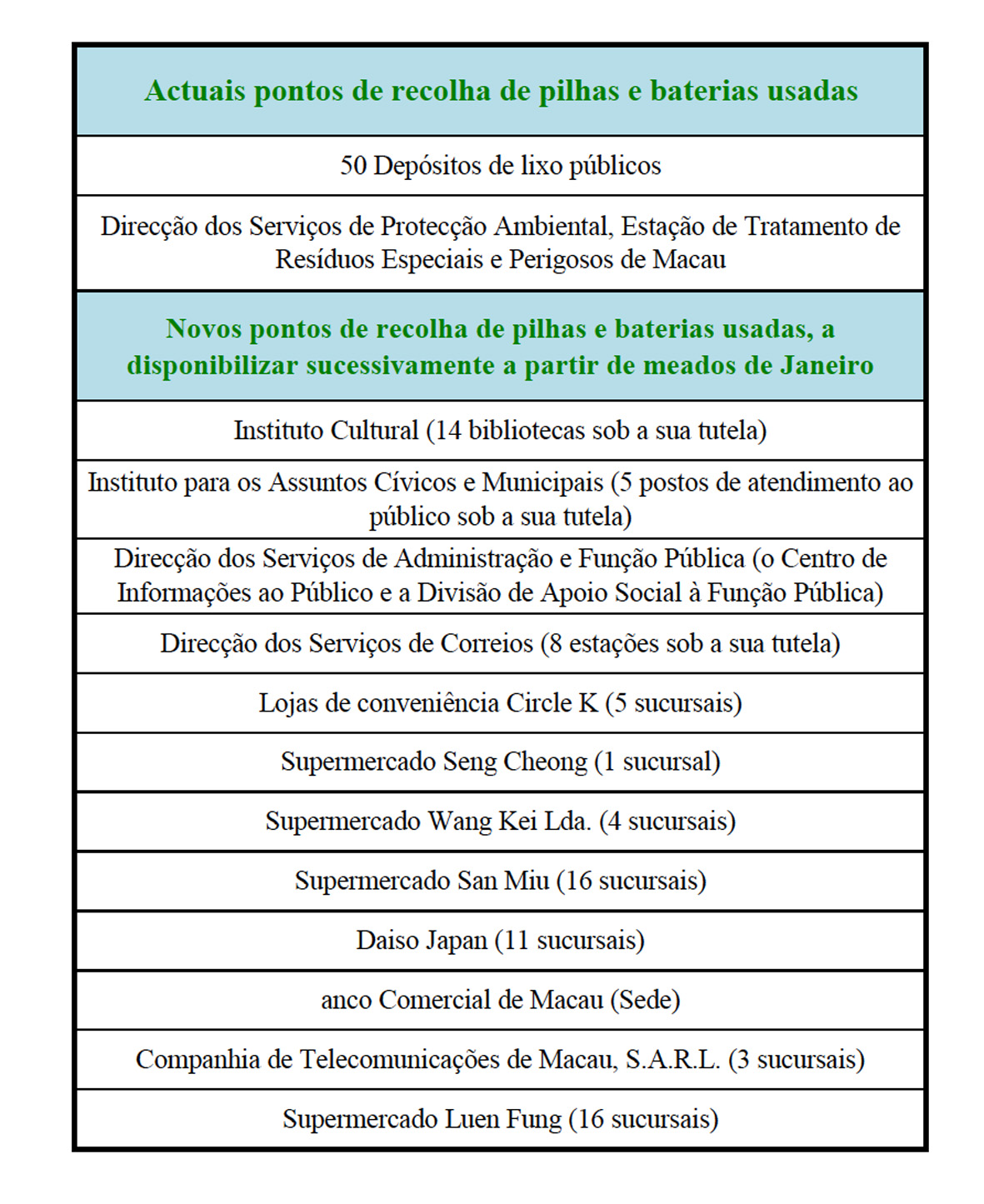 Os 50 depósitos de lixo públicos passíveis de receber as pilhas e baterias usadas cobrem todas as zonas de Macau, nomeadamente 42 depósitos na Península de Macau, 5 depósitos na Ilha da Taipa e 3 depósitos na Ilha de Coloane. Os pontos de recolha situados na DSPA e na Estação de Tratamento de Resíduos Especiais e Perigosos de Macau continuarão abertos ao público.