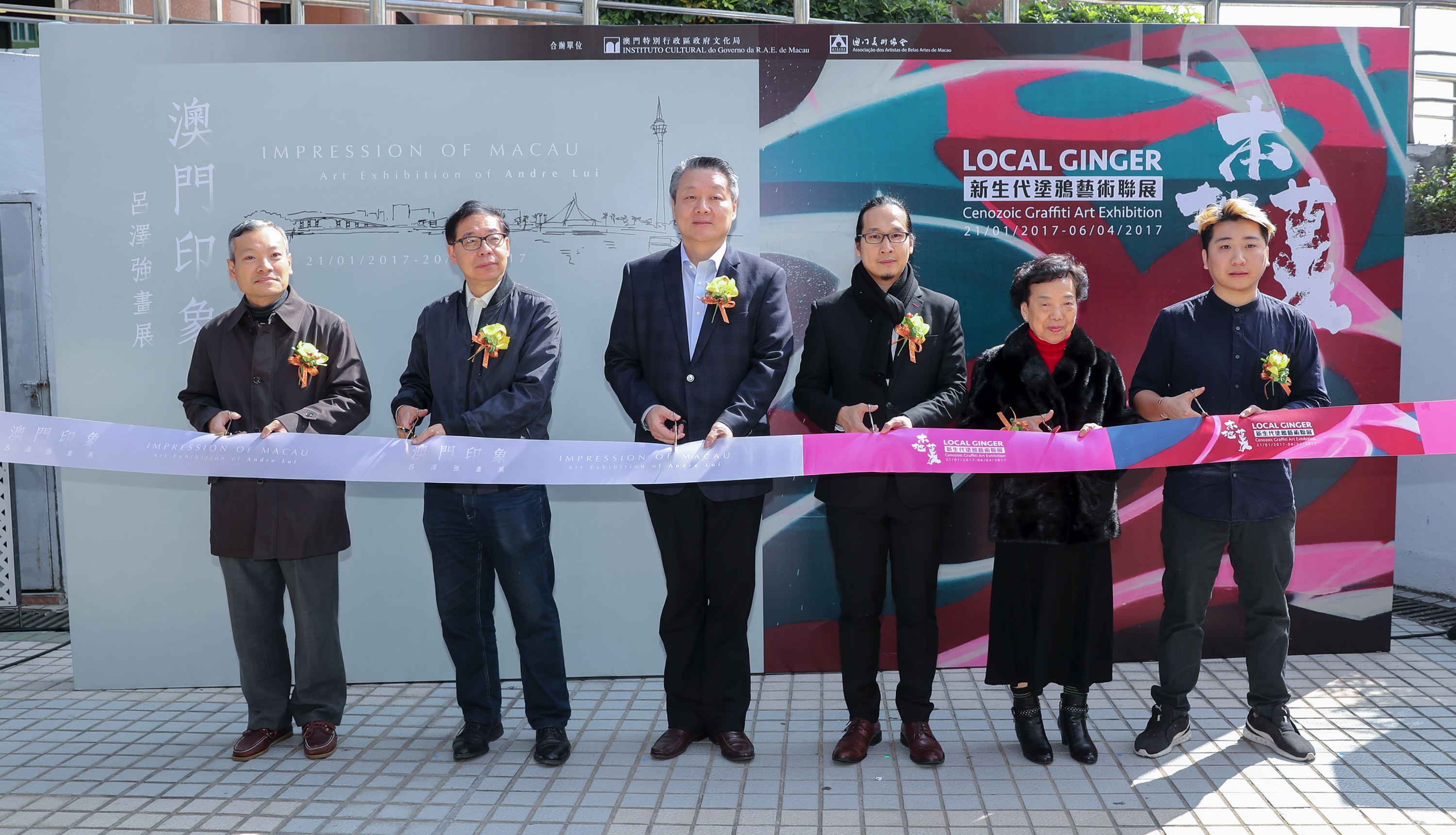 Co-organizada pelo Instituto Cultural e pela Associação dos Artistas de Belas-Artes de Macau, a cerimónia de inauguração das “Gengibre Local – Exposição Colectiva de Graffiti da Nova Geração” e “Impressão de Macau – Exposição de Pinturas do Artista Andre Lui” teve lugar no dia 21 de Janeiro (Sábado), pelas 12:00 horas, na Galeria Junto ao Lago no Anim’Arte NAM VAN.