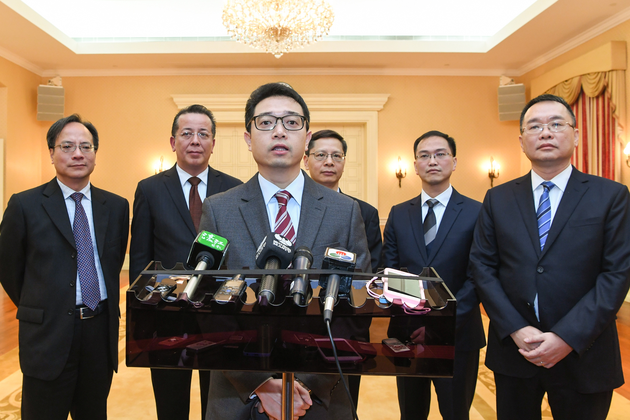 O presidente Tong Hio Fong e os vogais da Comissão de Assuntos Eleitorais da Assembleia Legislativa, Lai U Hou, José Maria da Fonseca Tavares,Kou Peng Kuan, Iong Kong Leong e Chan Chi Ping prestaram juramento, esta tarde, perante o Chefe do Executivo, Chui Sai On, na Sede do Governo.
