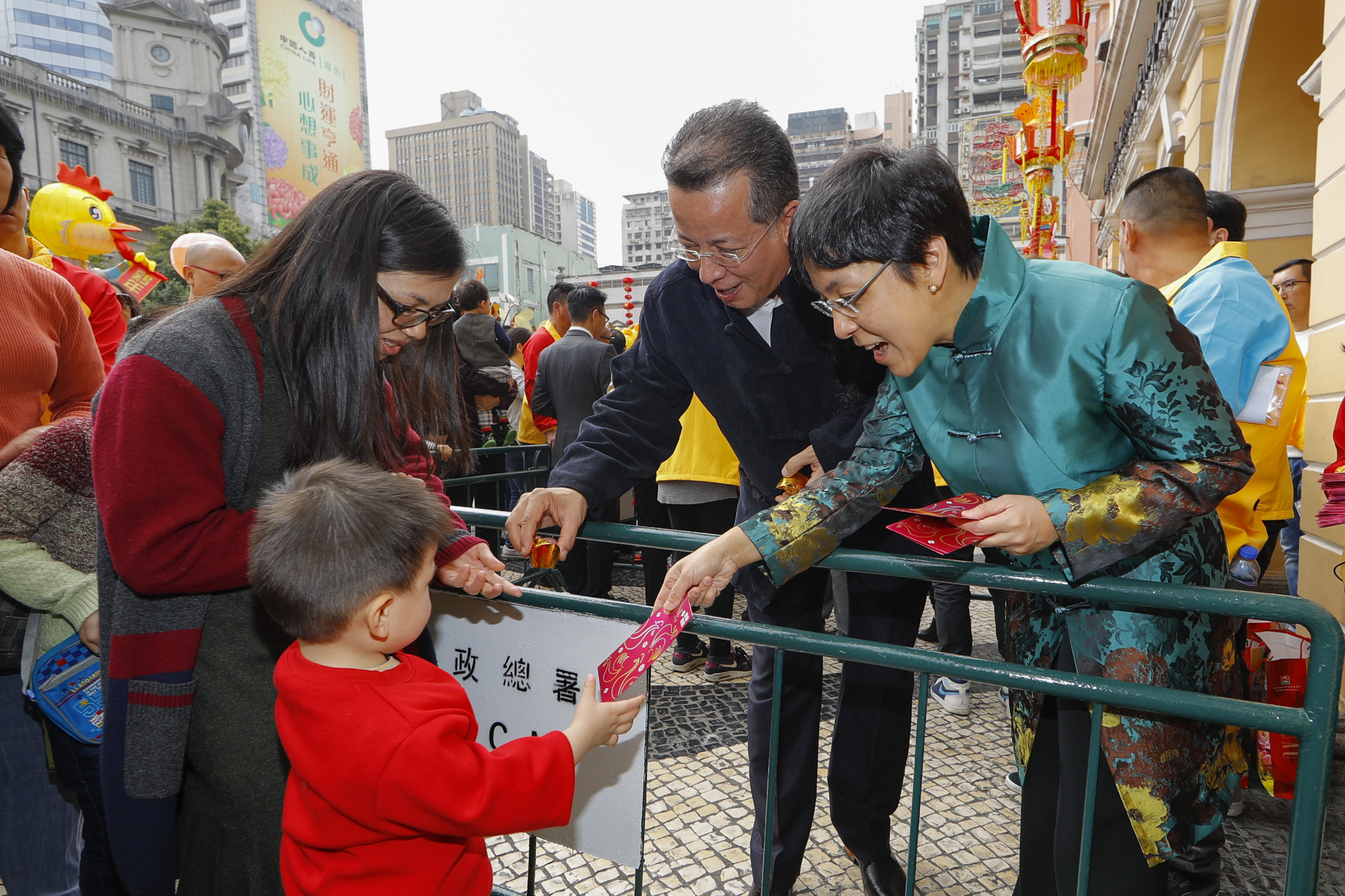 A directora da DST, Maria Helena de Senna Fernandes, o presidente do Conselho de Administração do IACM, José Tavares, os subdirectores da DST, Cecilia Tse e Cheng Wai Tong, a par com representantes da indústria turística, entre outros convidados, na manhã do primeiro dia do Ano, segundo o calendário lunar chinês, presidiram à cerimónia de vivificação do dragão gigante dourado e leões, no largo das Ruínas de S. Paulo, à qual se seguiu uma queima de panchões, no Largo do Senado. Os convidados, em conjunto com o Deus da Fortuna, distribuíram, em seguida, “lai-sis” e lembranças pelos residentes e visitantes no Largo do Senado, em ambiente de grande animação, sobretudo na altura de receber “lai-sis” das mãos do Deus da Fortuna, como sinal de boa sorte, fazendo votos de prosperidade e abundância para Macau.