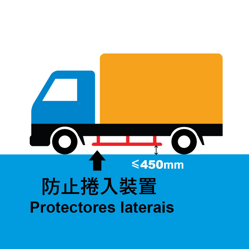 Nos termos do n.º 9 do artigo 38.º do Regulamento Administrativo n.º 24/2016 (Alteração ao Regulamento do Trânsito Rodoviário), os automóveis ligeiros e pesados de mercadorias, reboques e semi-reboques devem ser dotados com protectores laterais entre-eixos, um no lado direito e outro no lado esquerdo do veículo, de modelo aprovado pela DSAT e de forma a que o espaço livre entre esses protectores e o solo não seja superior a 450 mm. O dispositivo deve ser fixado estavelmente com o quadro de veículo ou outras partes de estruturas principais de veículo, impedindo que os peões, motociclos ou velocípedes penetrem na parte inferior de veículo. A largura do dispositivo não pode ultrapassar a de veículo e a superfície externa deve ser lisa.