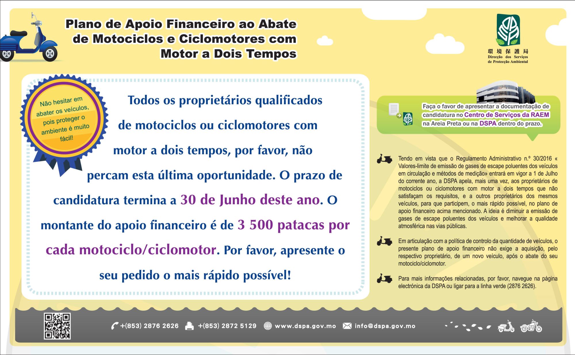 O prazo para a apresentação de candidaturas ao «Plano de Apoio Financeiro ao Abate de Motociclos e Ciclomotores com Motor a Dois Tempos» terminará a 30 de Junho de 2017 e tendo em conta a entrada em vigor do Regulamento Administrativo n.º 30/2016 “Valores-limite de emissão de gases de escape poluentes dos veículos em circulação e métodos de medição” a 1 de Julho de 2017, a DSPA apela, mais uma vez, aos proprietários – quer dos motociclos e ciclomotores com motor a dois tempos que não preencham os padrões, quer de outros motociclos e ciclomotores com motor a dois tempos – para apresentarem as suas candidaturas com a maior brevidade possível, em virtude de melhorar a qualidade do ar nas vias públicas de Macau e assegurar a saúde da população.
