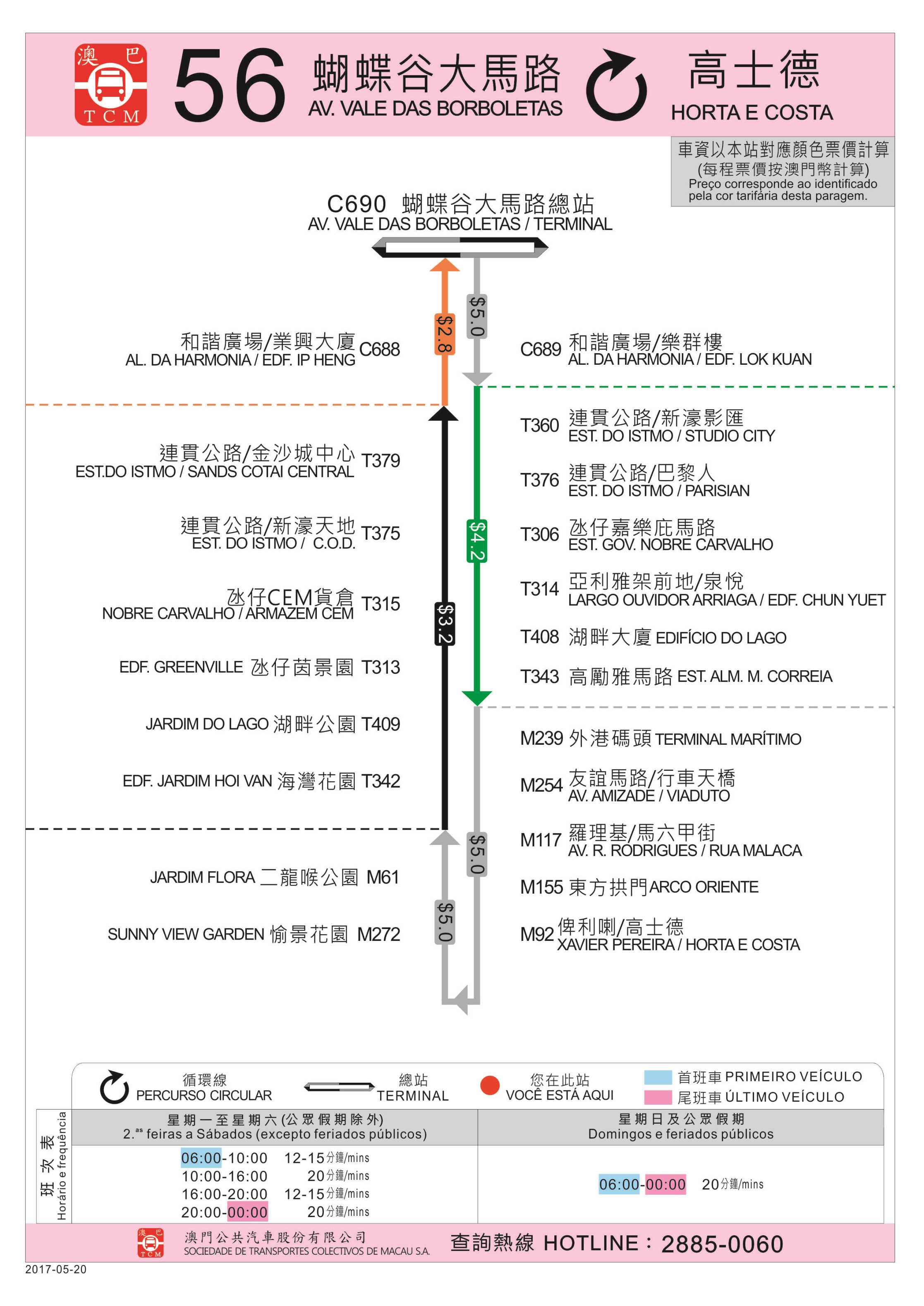 A partir do primeiro autocarro de 20 de Maio (sábado), a carreira n.º 56 estender-se-á até aos NAPE e à zona da Avenida Horta e Costa no sentido de responder às necessidades de deslocação dos cidadãos. Por outro lado, para assegurar a segurança de circulação de autocarros, a DSAT irá regular o tamanho de objectos trazidos pelos passageiros, portanto irá implementar, a título experimental, no mesmo dia, um limite para o objecto trazido pelo passageiro deve de ter como dimensões máximas (comprimento+largura+altura) 170 cm e o comprimento de qualquer um dos lados não pode exceder 130 cm, sendo que as cadeiras de rodas, carrinhos de bebés e instrumentos musicais estão isentos. O percurso da carreira irá, a partir de 20 de Maio, fazer também escala nas paragens “Est. Gov. Nobre Carvalho”, “Largo Ouvidor Arriaga /Edf. Chun Yuet”, “Av. R. Rodrigues / Rua Malaca”, "Arco Oriente", “Xavier Pereira/Horta e Costa”, “Sunny View Garden”, “Jardim Flora”, “Edf. Greenville” e “Nobre Carvalho/Armazém CEM, ” mantendo inalteráveis a frequência de partida. 7 carreiras alteram as frequências de partida em alguns períodos Conjuntamente com as operadoras de autocarros, a DSAT procedeu à avaliação da situação de transporte de passageiros nos diferentes períodos das carreiras de autocarros, tendo em conta o baixo número de passageiros nos feriados, fins-de-semana e horários com menos fluxo, serão ajustadas as frequências de partida das carreiras n.º 36, n.º 50X, n.º 51A, n.º 52, n.º 59, n.º MT4 e n.º MT5 (vide o mapa anexo). O serviço da carreira n.º MT5, que actua de segunda-feira a sexta-feira, das 7h00 às 21h00, passa a circular de segunda-feira a sexta-feira, das 7h00 às 10h00 e das 15h00 às 21h00, sendo o seu serviço suspenso aos sábados, domingos e feriados obrigatórios. Em articulação com a inauguração do Terminal Marítimo de Passageiros da Taipa, a designação de paragem “Terminal Marítimo Provisório” passará a ser “Terminal Marítimo de Passageiros da Taipa”. Após a inauguração oficial do terminal marítimo e da paragem de autocarros, todas as carreiras que passam pelo Terminal Marítimo de Passageiros da Taipa vão fazer escala na nova paragem. Implementação a título experimental das orientações de transporte de objectos A fim de assegurar a segurança de circulação de autocarros e dos passageiros, a DSAT e as operadoras elaboraram algumas orientações sobre o limite de tamanho de objectos transportados pelos passageiros dentro dos autocarros. A título experimental, a partir do dia 20 de Maio (sábado), fica definido que o objecto trazido pelo passageiro deve ter como dimensões máximas (comprimento+largura+altura) 170 cm e o comprimento de qualquer um dos lados não pode exceder 130 cm, sendo isentos cadeiras de rodas, carrinhos de bebés e instrumentos musicais. De alertar, que embora o objecto possa reunir os requisitos, o seu transporte será sempre sujeito à autorização do motorista que poderá considerar que o mesmo coloca em perigo os outros passageiros.