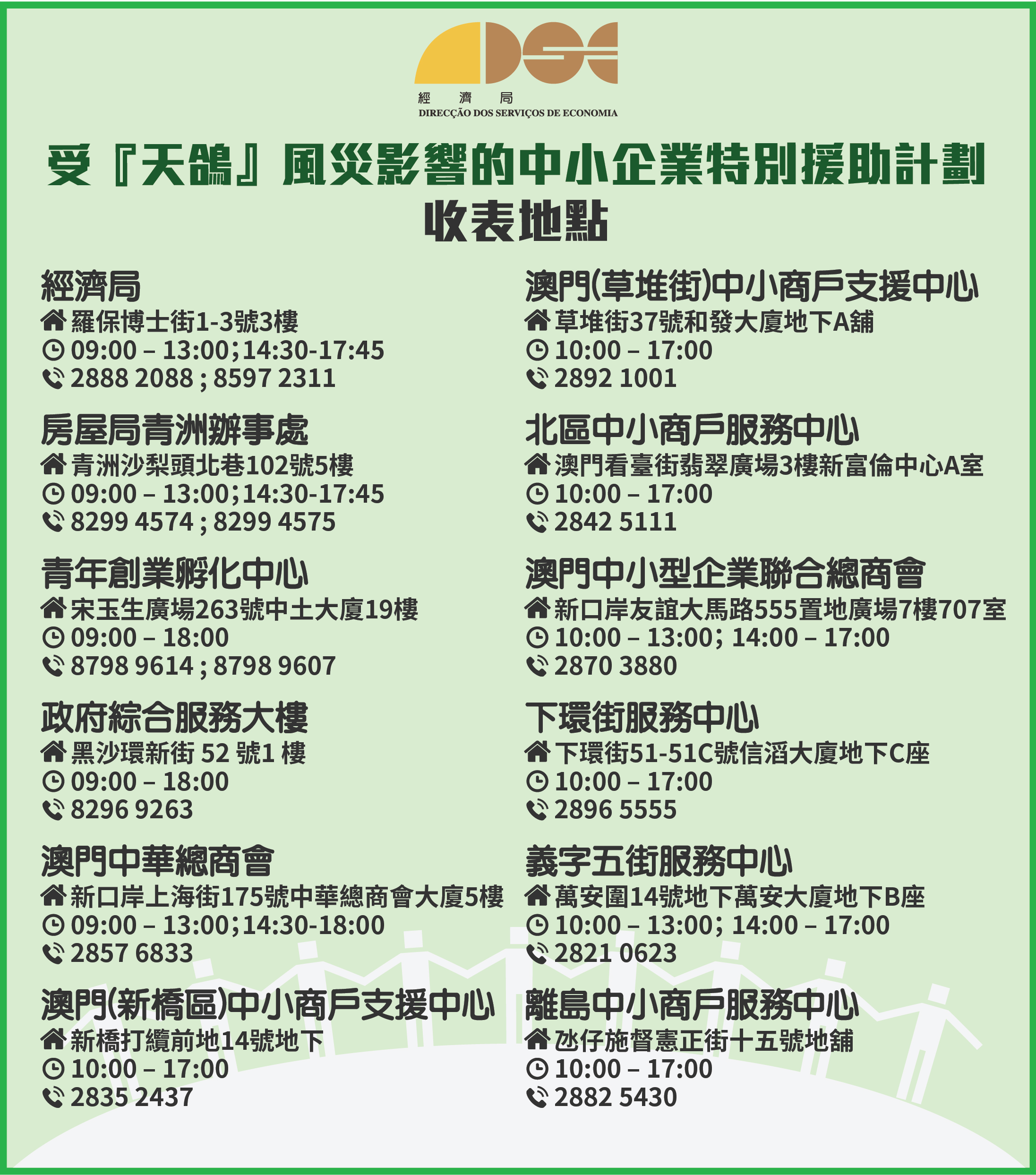 Além disso, a DSE, reunindo com outros serviços públicos e associações comerciais, continua a aproveitar a medida “Prestação de Serviços in loco” para destocar o pessoal a todos os bairros comunitários, de modo a aperceber-se das dificuldades enfrentadas pelos empresários afectados pelo tufão, ajudar as micro, pequenas e médias empresas na apresentação de pedidos, bem como oferecer-lhes apoios técnicos. Para mais informações, é favor telefonar 2888-2088 ou 8597-2311, ou consultar o Website da DSE ou a conta oficial de Wechat (DSEMACAU).