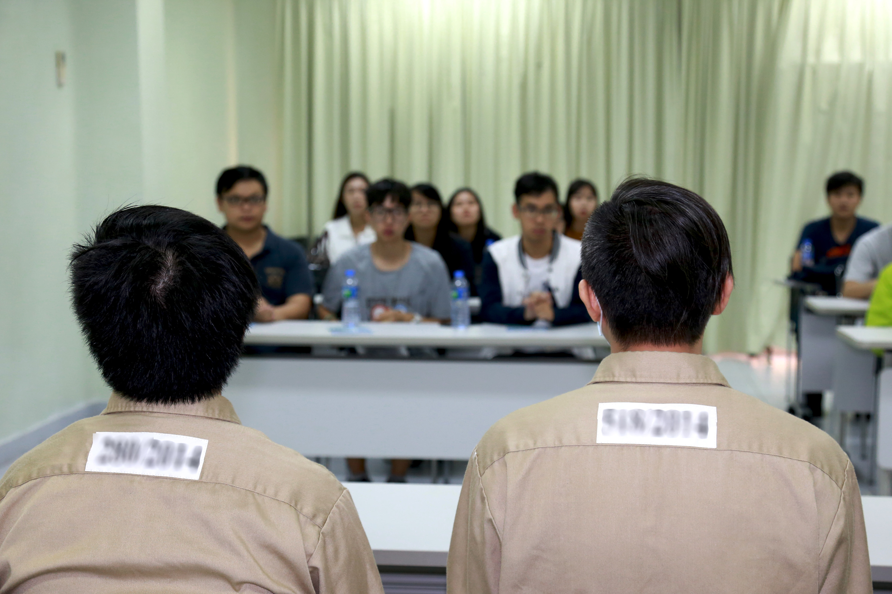 Na actividade, a DSC para além de apresentar as suas funções, o funcionamento quatidiano e as instalações e equipamentos do Estabelecimeno Prisional de Coloane aos participantes, foi organizada especialmente, uma experimentação da formação profissional dos reclusos aos participantes, permitindo estes a manufactuarem artesanatos juntamente com 4 reclusos adolescents na oficina de tipografia. Através desta oportunidade valiosa de intercâmbio directo, os jovens tiveram uma conversa com os reclusos, contando uns aos outros os pormenores da vida e, os reclusos adolescentes partilharam, por iniciativa própria, as suas histórias e experiências do crime que causaram a perda de liberdade. Depois de ouvir as experiências contados pelos reclusos, os participantes tomaram consciência de serem mais alertados, no sentido de afastar das seduções que possam causar o cometimento de crime, caso contrário, correm risco de assumir as consequências legais graves.