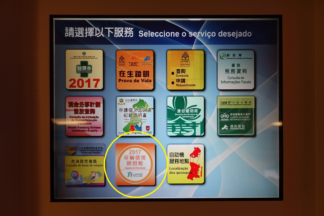 Assim sendo, a partir de 20 de Novembro, quem efectuar o pagamento on-line/a emissão, em segunda via, do imposto de circulação, desde que optem pela impressão por auto-serviço, receberão uma mensagem curta no telemóvel com referência “pagamento bem sucedido”, da qual consta o número de consulta. Posteriormente, poderão obter um código de autenticação de mensagem curta do telemóvel, com a introdução do número de consulta e dos últimos quatro dígitos do telemóvel nos quiosques de auto-serviço da DSI, localizados no Centro de Saúde da Areia Preta, Edifício “China Plaza”, Centro de Saúde da Nossa Senhora Carmo-Lago da Taipa ou Edifício Ip Heng em Seac Pai Van, Coloane. Feita a verificação da matrícula e introdução do código de autenticação, poderão imprimir o respectivo dístico do imposto de circulação. O imposto de circulação de 2017 é apenas objecto da emissão, em segunda via, cujo último dia da impressão coincide com 28 de Dezembro do corrente ano.