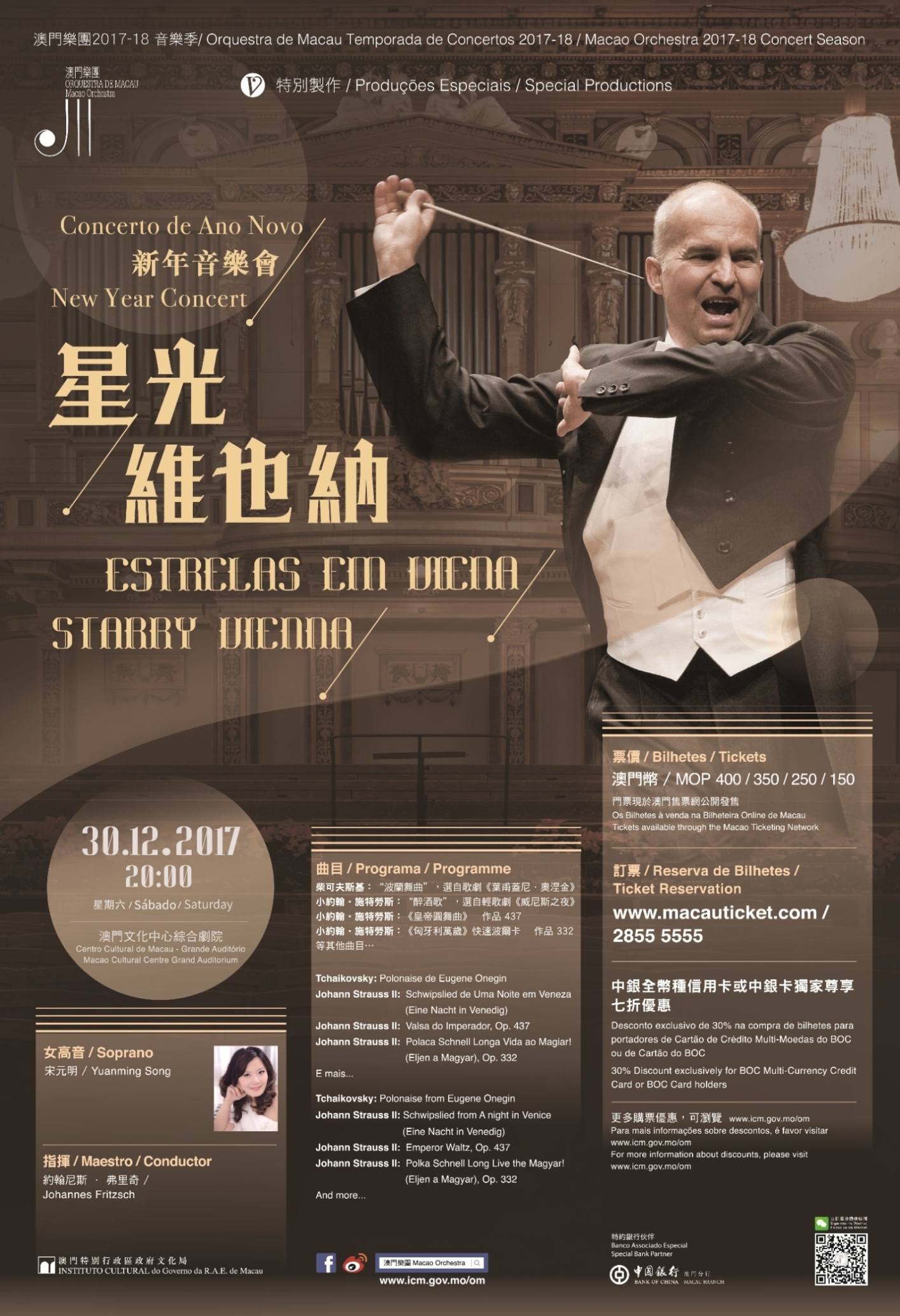 Uma festa musical vienense da família Strauss tornou-se uma tradição de Ano Novo em todo o mundo. Este ano, sob a batuta do notável maestro alemão Johannes Fritzsch, a OM associa-se à célebre soprano Yuanming Song para oferecer ao público o exuberante “Som de Viena”. Com melodias radiantes, o concerto terá lugar num ambiente repleto de decorações festivas que permitirá ao público sentir-se como se estivesse num concerto em Viena. O programa não inclui somente peças do repertório tradicional vienense de Ano Novo, mas ainda trechos de ópera de Piotr Ilyich Tchaikovsky e de Emmerich Kálmán, a fim de complementar esta festa musical com um toque de exotismo. Anunciando o início do novo ano, este concerto é certamente uma gala musical a não perder!
