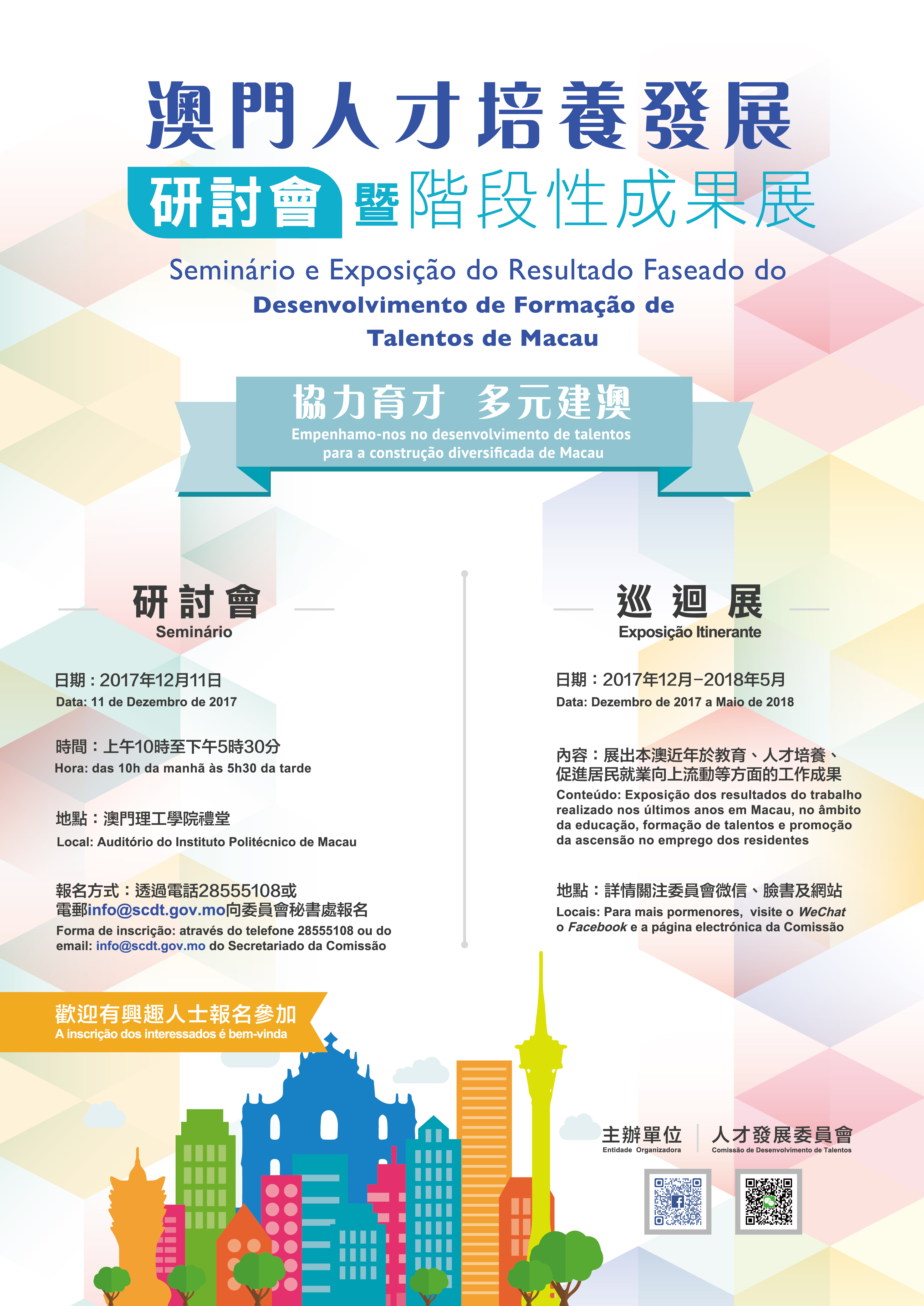 Em simultâneo, será realizada uma exposição sobre os resultados dos trabalhos da formação de talentos desenvolvidos pelo Governo da RAEM nos últimos anos e os painéis informativos serão colocados, entre Dezembro de 2017 e Maio de 2018, em diferentes locais, tais como, instituições de ensino superior, centros do Governo de prestação de serviços ao público e nas instalações das associações de Macau. As informações dos locais de exibição estão disponíveis no website da Comissão de Desenvolvimento de Talentos (http://www.scdt.gov.mo).