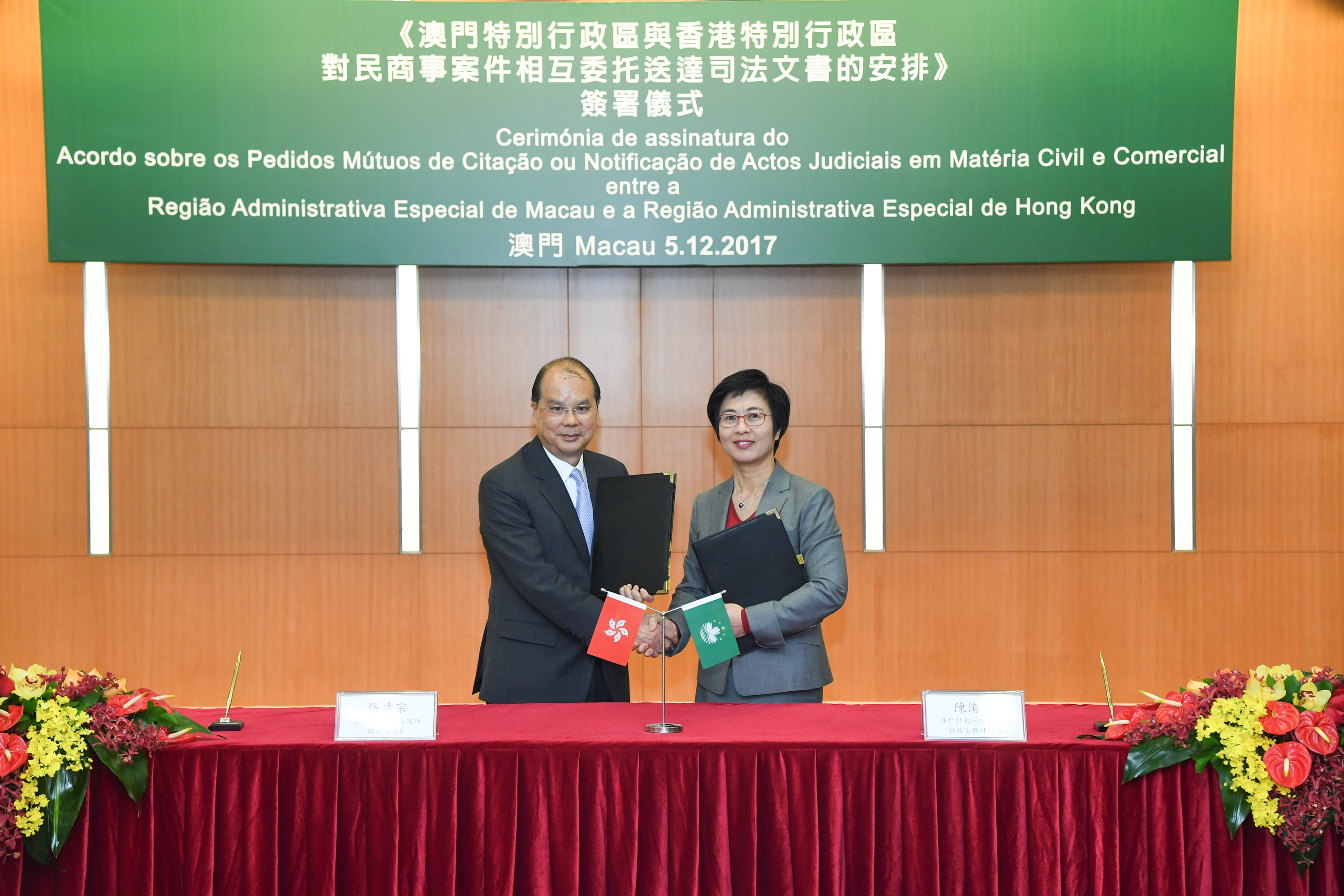 Hoje (dia 5 de Dezembro), a Secretária para a Administração e Justiça, Sónia Chan, em representação da Região Administrativa Especial de Macau, e o Secretário para a Administração, Matthew Cheung, em representação da Região Administrativa Especial de Hong Kong, assinaram, na sede do Governo da RAEM, o “Acordo sobre os Pedidos Mútuos de Citação ou Notificação de Actos Judiciais em Matéria Civil e Comercial entre a Região Administrativa Especial de Macau e a Região Administrativa Especial de Hong Kong”. O aludido Acordo simboliza o resultado bem-sucedido dos trabalhos de negociação.