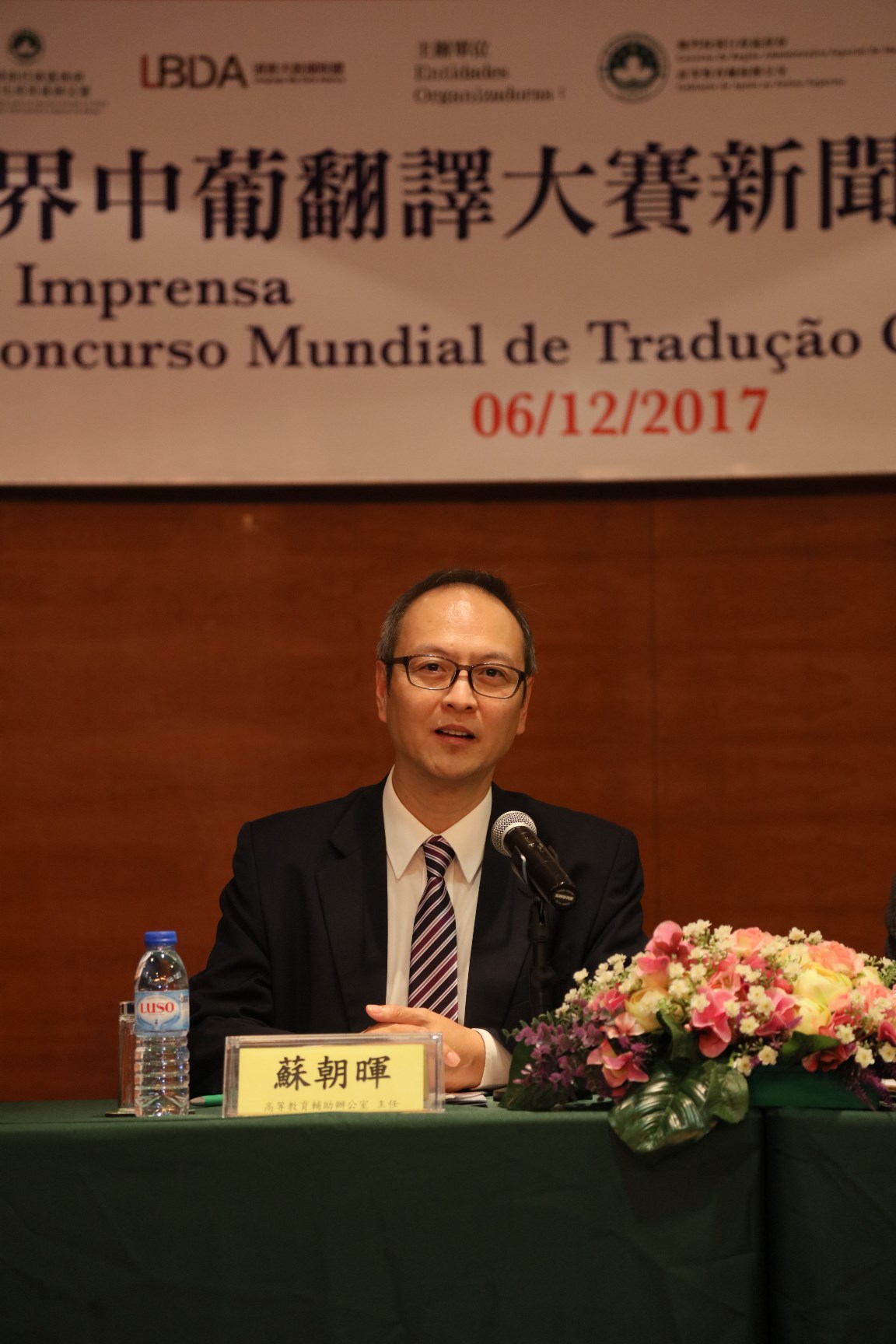 A conferência de imprensa da 2ª edição do Concurso Mundial de Tradução Chinês-Português, que teve lugar às 16h00, no dia 06 de Dezembro (quarta-feira), foi presidida pelo Coordenador do Gabinete de Apoio ao Ensino Superior, Doutor Sou Chio, Presidente do Instituto Politécnico de Macau, Professor Doutor Lei Heong Iok, Vice-presidente do Instituto Politécnico de Macau, Professor Doutor Marcus Im e Presidente da Comissão Académica da 2ª edição do Concurso Mundial de Tradução Chinês-Português, Professor Doutro James Li, publicando e apresentando o regulamento e as informações sobre o Concurso. O senhor coordenador do GAES, Sou Chio Fai, aponta que Macau desempenha um papel muito importante e insubstível enquanto base de formação de talentos bilingues chinês-português e o GAES oferece pleno apoio a esforços de promover o desenvolvimento desse aspecto. No ano passado, com a iniciativa proposta pelo IPM, a primeira edição do Concurso Mundial de Tradução Chinês-Português foi realizado, com grande sucesso, conjuntamente pelo GAES e pelo IPM. O senhor coordenador espera que a segunda edição do Concurso possa atrair mais equipas e obter mais êxitos. Quando o senhor Presidente do IPM, Prof. Lei Heong Iok, faz votos de um pleno sucesso ao Concurso, ainda afirma que o IPM se dedica desde sempre ao ensino-aprendizagem de tradução Chinês-Português e o Concurso também visa fortalecer a comunicação de técnicas de tradução Chinês-Português entre estudantes das instituições de ensino superior de todo o mundo e desenvolver a formação de tradutores profissionais de Chinês-Português, aproveitando condições favoráveis do IPM para dar contributos para o desenvolvimento e a promoção do ensino-aprendizagem de Português.