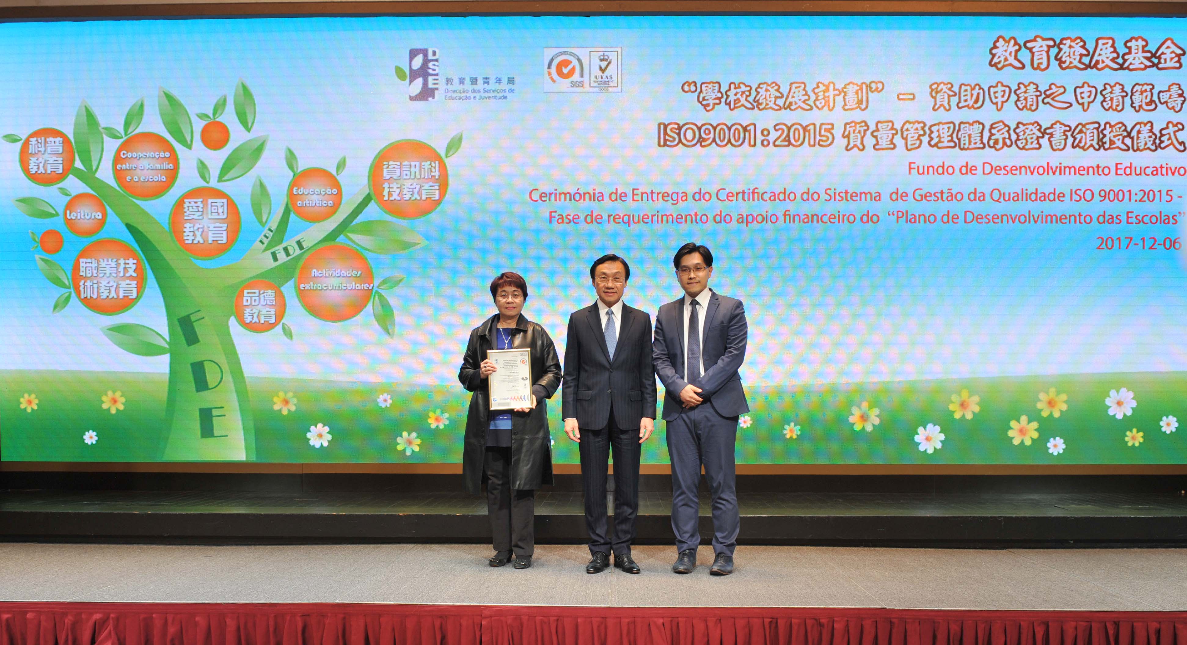 A reunião conjunta dos Conselhos de Educação para o Ensino Não Superior e de Juventude teve lugar na tarde do dia 6 de Dezembro, na Torre de Macau, e foi presidida pelo presidente dos dois conselhos, o Secretário para os Assuntos Sociais e Cultura, Alexis Tam Chon Weng. Antes do início da reunião, realizou-se a Cerimónia de Entrega do Certificado do Sistema de Gestão da Qualidade ISO 9001:2015, relativa à fase de requerimento do apoio financeiro do “Plano de Desenvolvimento das Escolas” e foram atribuídos os Certificados de Reconhecimento “Cidade de Amor, Pessoas Afectuosas” às associações juvenis que participaram nos trabalhos voluntários realizados após a calamidade resultante da passagem do tufão Hato pela região.