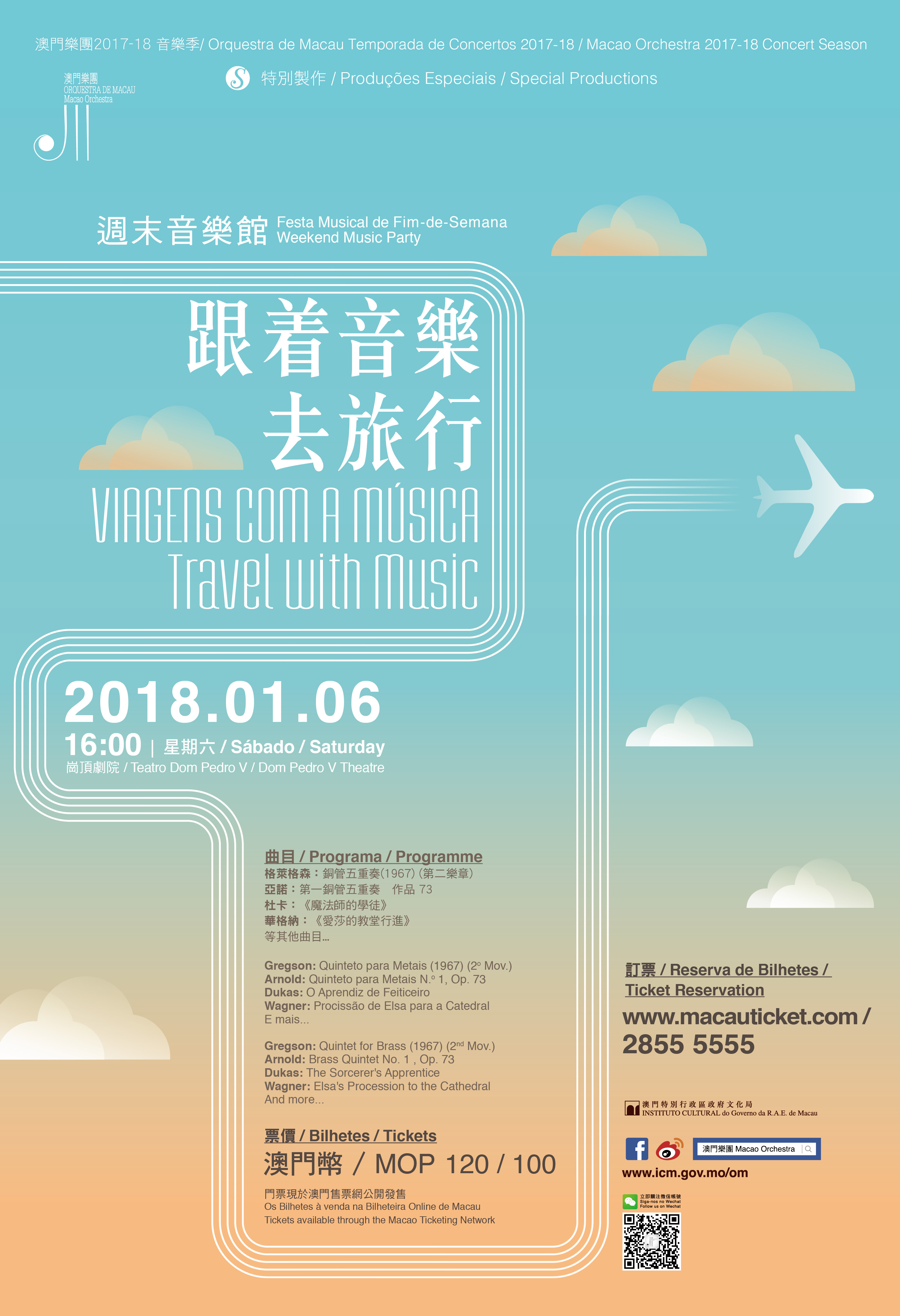 A Orquestra de Macau (OM), sob os auspícios do Instituto Cultural, apresenta o concerto “Festa Musical de Fim-de-Semana – Viagens com a Música” no dia 6 de Janeiro de 2018 (Sábado), pelas 16:00 horas, no Teatro D. Pedro V, levando o público numa fascinante viagem musical. Os bilhetes encontram-se à venda na Bilheteira Online de Macau.