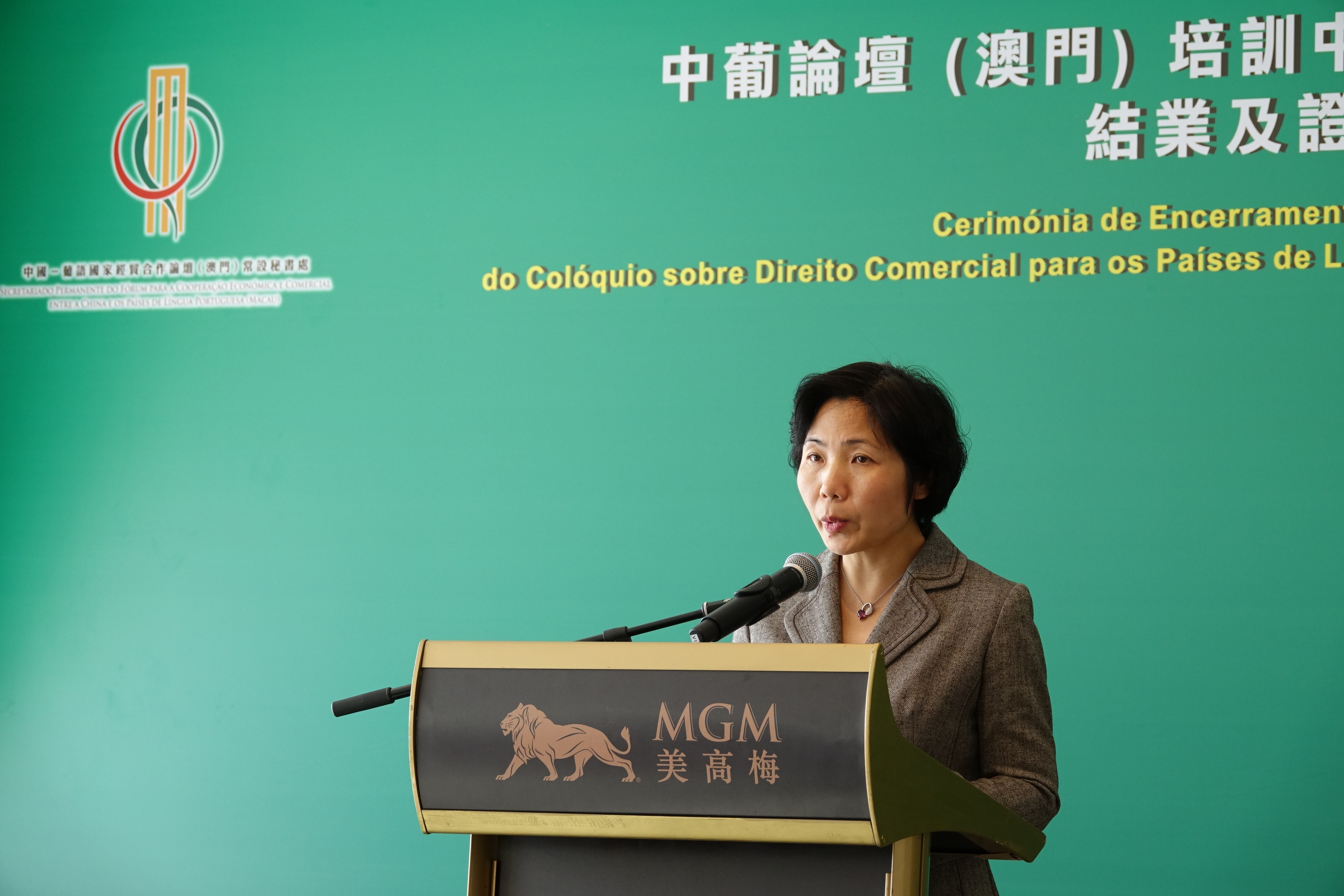 Realizou-se no dia 18 de Dezembro de 2017, no Hotel MGM, a Cerimónia de Encerramento e de Entrega de Certificados do “Colóquio sobre Direito Comercial para os Países de Língua Portuguesa” do Centro de Formação do Fórum de Macau, ministrado pela Universidade da Cidade de Macau. A cerimónia de encerramento contou com a presença da Secretária-Geral do Secretariado Permanente do Fórum de Macau, Dra. Xu Yingzhen, do Director-Geral Adjunto do Departamento dos Assuntos Económicos do Gabinete de Ligação do Governo Central da República Popular da China na RAEM, Dr. Wang Jiabao, do Ministro Conselheiro dos Assuntos Consulares do Consulado da República de Moçambique na RAEM, Dr. Francisco Domingos Manhisa, da Vice-Reitora da Universidade da Cidade de Macau, a Professora Kong Fan Qing e ainda os Delegados dos Países de Língua Portuguesa junto do Fórum de Macau. A Secretária-Geral do Secretariado Permanente do Fórum de Macau, Dra. Xu Yingzhen, a Professora Kong Fan Qing da Universidade da Cidade de Macau e o representante rotativo do “Colóquio sobre Direito Comercial para os Países de Língua Portuguesa”, Dr. Joaquim Morais proferiram discurso na cerimónia de encerramento.