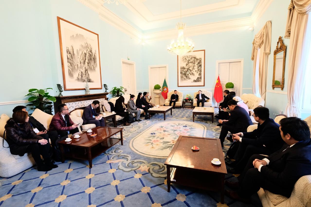 Para promover ainda mais a cooperação e intercâmbio de inovação e empreendedorismo para jovens da China e dos países de língua portuguesa, valorizando o papel do Centro de Intercâmbio de Inovação e Empreendedorismo para Jovens da China e dos Países de Língua Portuguesa como plataforma de encontro e intercâmbio entre as startups do Interior da China, de Macau e dos países lusófonos, a DSE chefiou uma delegação composta pelos 20 membros, incluindo representantes do Instituto de Promoção e Investimento de Macau, Parafuturo de Macau Investment and Development Limited, organização de empreendedorismo juvenil em Qianhai, Shenzhen, bem como 11 associações de jovens de Macau, para realizar uma actividade de intercâmbio de empreendedorismo juvenil em Lisboa e Porto, Portugal, nos dias 5 a 11 de Fevereiro. Na companhia da Chefe da Delegação Económica e Comercial de Macau, em Lisboa, O Tin Lin, a delegação visitou, em primeiro lugar, o Embaixador Extraordinário e Plenipotenciário da República Popular da China em Portugal, Cai Run, que fez uma apresentação sobre o desenvolvimento económico de Portugal e a recente situação da cooperação sino-portuguesa nas áreas de investimento, economia e comércio. O Embaixador Cai Run referiu que a cooperação em investimentos entre a China e os países de língua portuguesa está cada vez mais intensificada, pelo que Macau deve reforçar a cooperação com Portugal na área de empreendedorismo e inovação no sentido de valorizar o papel de Macau enquanto plataforma sino-lusófona. O Director dos Serviços de Economia, Tai Kin Ip, apresentou ao Embaixador Cai Run o objectivo da visita que consiste em promover continuadamente os trabalhos do Centro de Intercâmbio de Inovação e Empreendedorismo para Jovens da China e dos Países de Língua Portuguesa e acompanhar o andamento do Programa de Intercâmbio de Inovação e Empreendedorismo para Jovens da China e dos Países de Língua Portuguesa, na expectativa de promover o intercâmbio entre organizações de empreendedorismo juvenil de Macau, do Interior da China e de Portugal, partilhando experiências e inspirando novas ideias dos jovens empreendedores dos três lados.