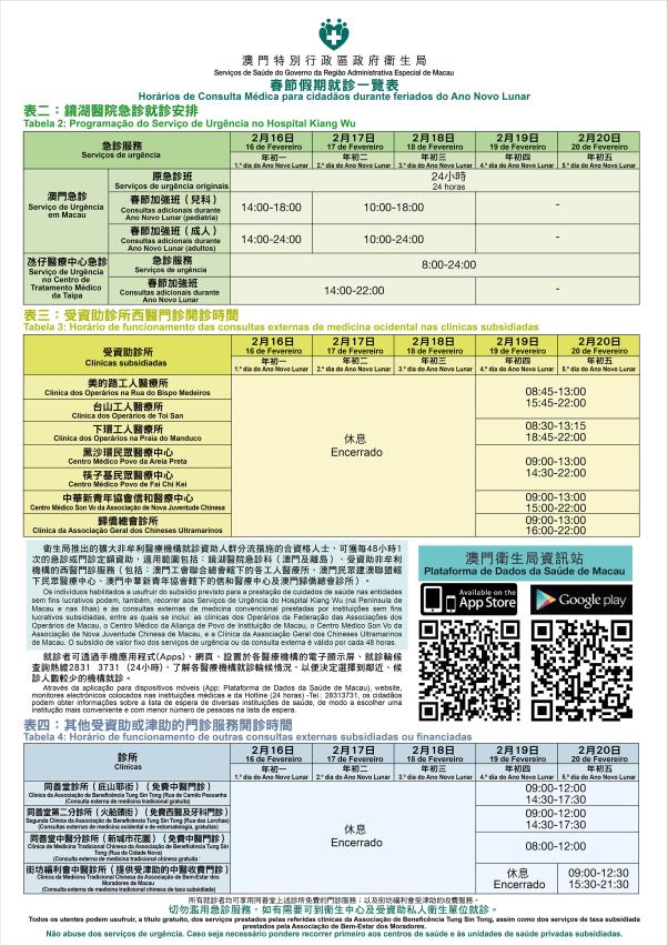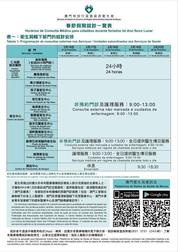 Dado os dias de 16 a 18 de Fevereiro (1.o, 2.o e 3.odia do Novo Ano Lunar Chinês) serem feriados do Novo Ano Lunar e os dias 19 e 20 de Fevereiro (4.o e 5.odia do Novo Ano Lunar Chinês) serem tolerâncias de ponto para os trabalhadores da administração pública com aprovação do Chefe do Executivo, os Serviços de Saúde irão assegurar a assistência médica aos utentes que necessitem de consulta médica durante o período de 16 a 20 de Fevereiro (1.o, 2.o, 3.o, 4.o e 5.o dia do Novo Ano Lunar Chinês) da seguinte forma: