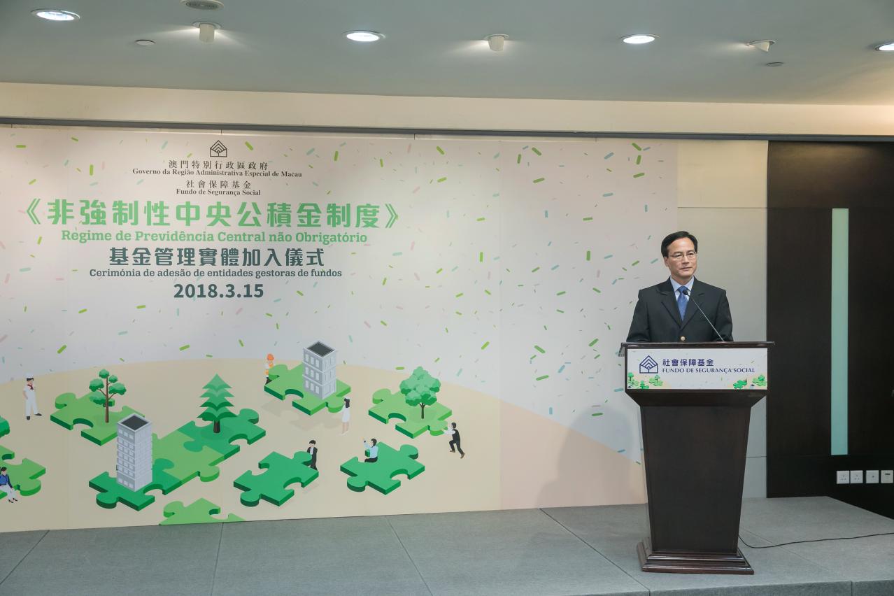 O Regime de Previdência Central não Obrigatório foi implementado no dia 1 de Janeiro do corrente ano. O Fundo de Segurança Social realizou hoje (dia 15) uma cerimónia de adesão de entidades gestoras de fundos, afirmando o suporte do Regime de Previdência Central não Obrigatório por sete entidades gestoras de fundos que foram as primeiras entidades a aderir ao regime.