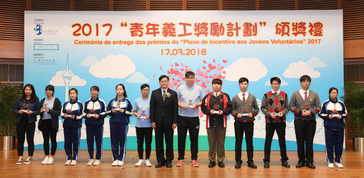 A Cerimónia de entrega dos prémios do “Plano de Incentivo aos Jovens Voluntários” 2017 organizado pela Direcção dos Serviços de Educação e Juventude (DSEJ) e realizado pelo Hope International Volunteer Group Macao em colaboração com o Centro de Ciência de Macau, S.A., teve lugar no dia 17 de Março de 2018 (Sábado), no Centro de Ciência de Macau. A actividade contou com a participação de cerca de 350 pessoas e teve como objectivo elogiar e reconhecer o contributo dos jovens voluntários em prol da sociedade, promovendo a continuidade da participação activa dos jovens voluntários e incentivando o voluntariado, bem como estimulando a adesão a este serviço por parte dos sectores sociais e jovens, desenvolvendo o espírito de ajuda ao próximo e a si próprio, inserindo energia positiva na sociedade de Macau.