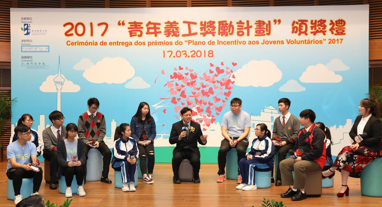 Durante a cerimónia, foram distribuídos um total de 380 Prémios aos jovens voluntários, incluindo 15 Prémios de Platina dos Jovens Voluntários (com a obtenção acumulada de dois “Prémios de Ouro de Jovens Voluntários”), 59 Prémios de Ouro dos Jovens Voluntários (com um serviço voluntário não inferior a 300 horas), 96 Prémios de Prata dos Jovens Voluntários (com um serviço voluntário não inferior a 200 horas) e 210 Prémios de Bronze dos Jovens Voluntários (com um serviço voluntário não inferior a 100 horas). No final, o Director Lou Pak Sang trocou ideias, no palco, com os 12 voluntários vencedores do Prémio de Platina dos Jovens Voluntários. Entre outros assuntos mencionados pelos jovens voluntários destacaram-se: o equilíbrio entre os estudos, a vida e os trabalhos voluntários, o estímulo à participação das pessoas empregadas nos assuntos da sociedade e o auxílio à promoção dos trabalhos voluntários aos diferentes níveis, entre outros aspectos; em conclusão Lou Pak Sang referiu que os jovens voluntários devem servir de exemplo e possuir uma determinada competitividade, esperando que mais jovens possam participar no voluntariado de modo a contribuírem com a sua energia positiva para Macau. Os assuntos discutidos na sessão de partilha reflectiram os sentimentos comuns entre os presentes e os jovens voluntários.
