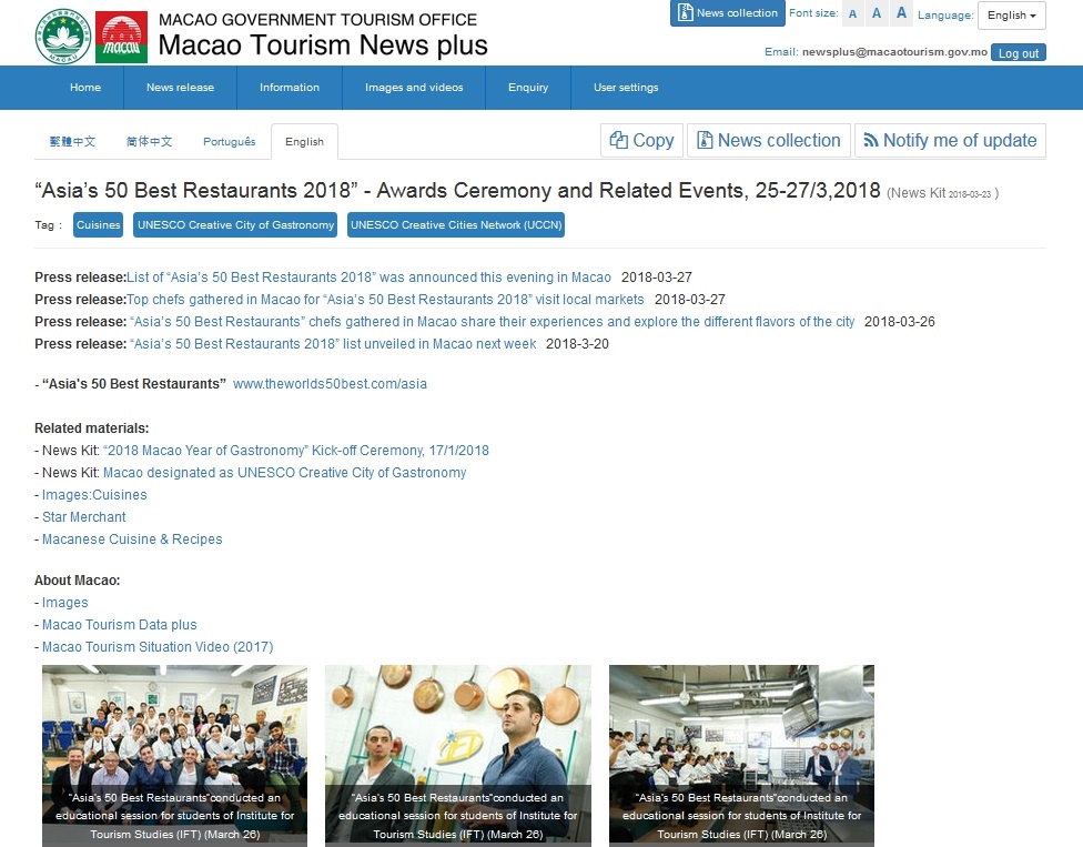Lançada em finais de 2016, a “Macao Tourism News plus” (“News plus”) teve como destinatários jornalistas e editores dos órgãos de comunicação social. O conteúdo da base de dados tem vindo continuamente a aumentar desde o seu lançamento até agora. A base de dados disponibiliza actualmente mais de 1.600 notas de imprensa, 6.600 textos com informações de actividades e 8.500 imagens, num total de perto de 17.000 registos. Por outro lado, também são criadas pastas de informações temáticas para os eventos em destaque, com o intuito de facilitar a obtenção de diferentes materiais noticiosos pelos utilizadores.
