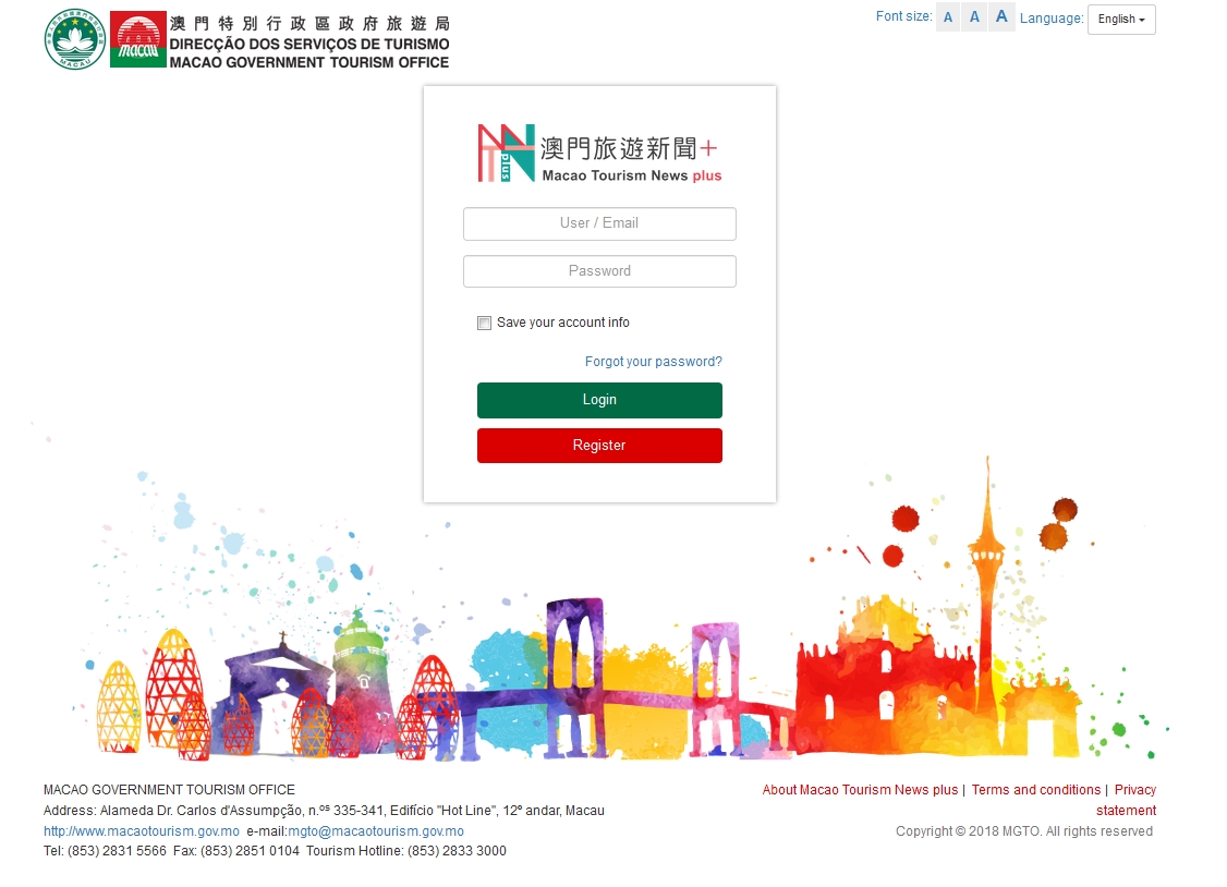A DST extende o convite a pessoal da área de relações com a imprensa e comunicação da indústria turística e de pessoal da indústria turística do exterior recomendado pelos representantes da DST, a criarem contas de utilizadores da “Macao Tourism News plus” http://newsplus.macaotourism.gov.mo. Para mais informações enviar email para newsplus@macaotourism.gov.mo.