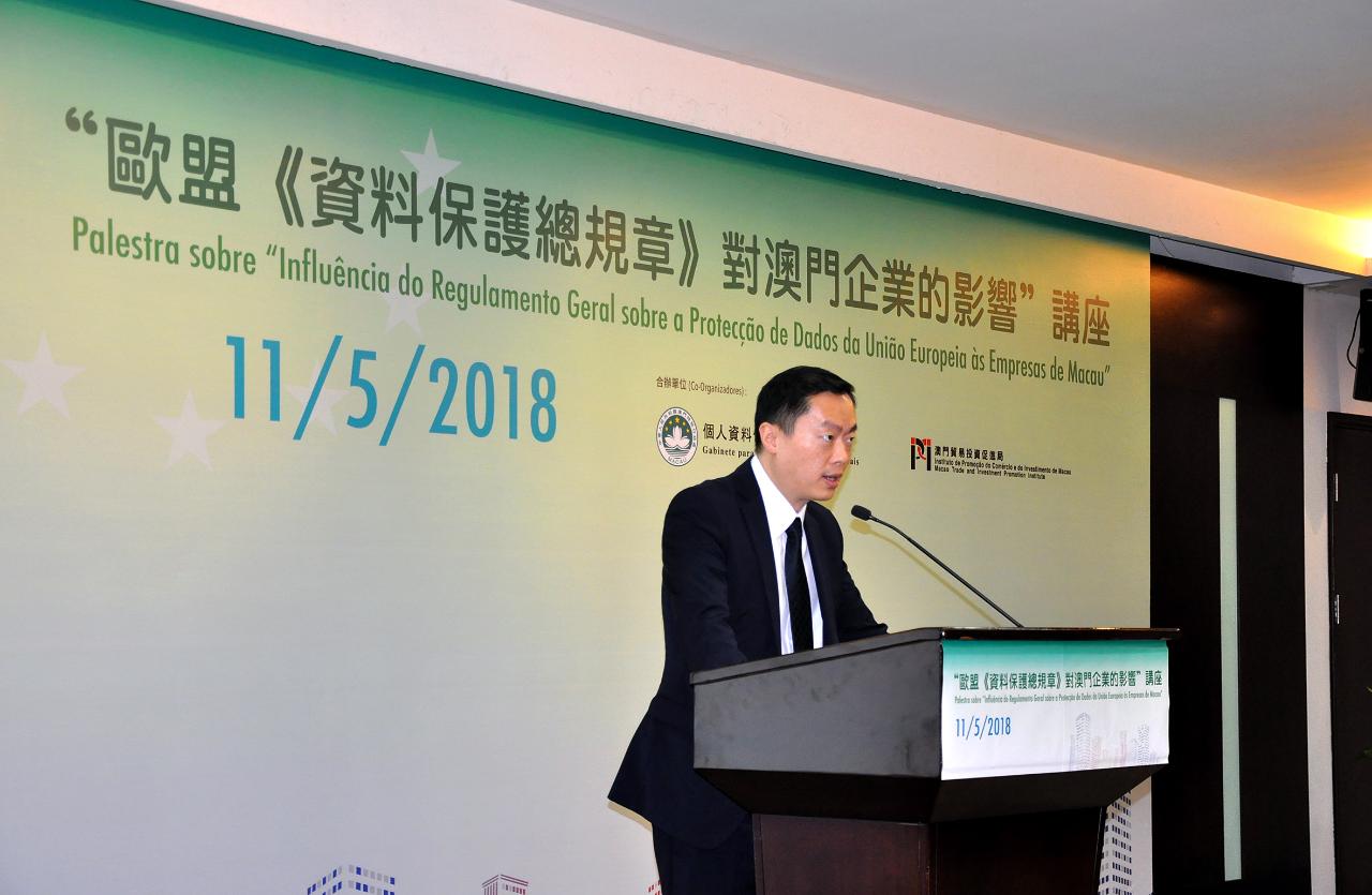 Com o objectivo de ajudar as empresas relevantes de Macau a responder activamente às últimas mudanças do regulamento da União Europeia, o GPDP e o IPIM organizaram a Palestra sobre “Influência do Regulamento Geral sobre a Protecção de Dados da União Europeia às empresas de Macau” realizada na Sala Polivalente, 19.o andar do Edifício “China Civil Plaza”, Macau, pelas 15:00 do dia 11 de Maio, na palestra, o chefia funcional da área jurídica do GPDP, Ho Heng Lam apresentou os pormenores do novo regulamento. As duas entidades esperam que as empresas de Macau enriqueçam os conhecimentos sobre o referido regulamento através da palestra e que discutam a influência deste regulamento à Macau, a fim de fortalecer a consciência da protecção de dados pessoais e compreender as últimas tendências em questão de protecção de dados pessoais a nível internacional.
