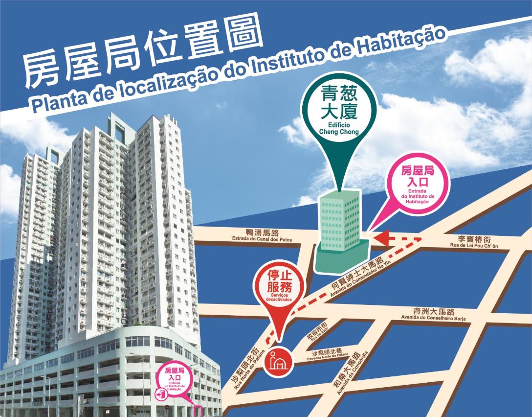A partir do dia 28 de Maio de 2018, as instalações do Instituto de Habitação (IH) do Governo da Região Administrativa Especial de Macau irão mudar da Travessa Norte do Patane para a Estrada do Canal dos Patos, n.º 220, Macau, sendo a actual sede desactivada a partir da referida data. Os números de telefone e de fax, a página electrónica e o correio electrónico do IH mantêm-se inalterados.