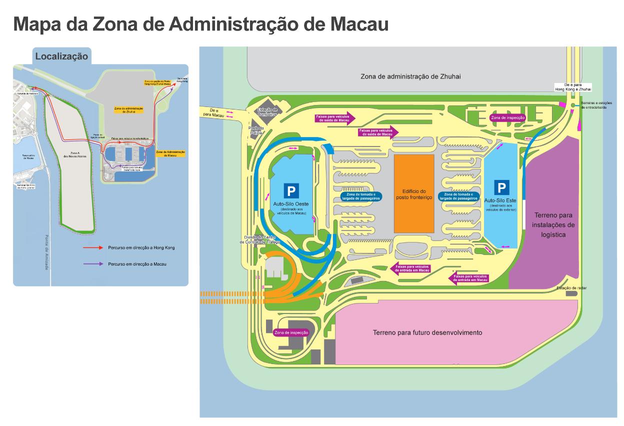 Tendo em conta que a ponte Hong Kong-Zhuhai-Macau está prestes a entrar em funcionamento, os serviços intervenientes estão empenhados em aperfeiçoar o planeamento de gestão da Zona de Administração, com vista a uma boa preparação para a entrada em funcionamento da referida obra de arte. No que se refere às instalações de trânsito, o auto-silo leste e o auto-silo oeste são destinados respectivamente aos visitantes e aos residentes locais. O auto-silo leste tem uma capacidade de 3 000 lugares para servir os automóveis ligeiros que chegam a Macau através da ponte. Os cidadãos e os visitantes que chegam à Zona de Administração, depois de tratar as formalidades de entrada, podem tomar no piso térreo (espaço para tomada e largada de passageiros) da zona oeste os meios de transporte preferidos para ir até ao centro urbano de Macau. A zona de tomada de passageiros dispõe de paragem de autocarros, praça de táxis e espaço para automóveis ligeiros e motociclos, paragem de veículos pesados de passageiros das agências de turismo, paragem de veículos pesados de passageiros dos hotéis, assim como paragem de veículos pesados de passageiros dos casinos, paragem de autocarros de turismo interurbanos e espaço para tomada de passageiros dos automóveis ligeiros autorizados a fazer viagem interurbana através da ponte e parque de estacionamento dos veículos pesados de passageiros.