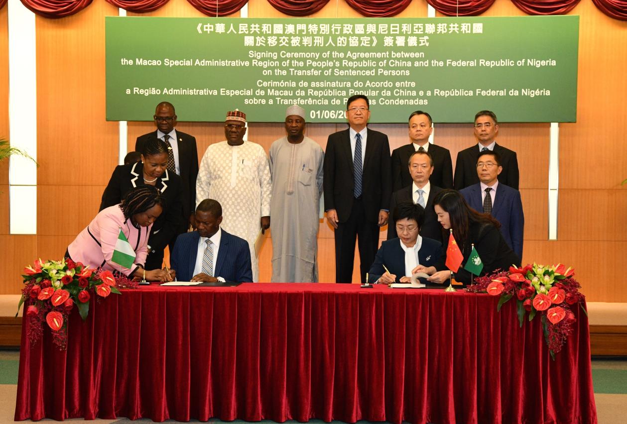 Hoje (1 de Junho), a Exma. Sra. Dra. Sónia Chan, Secretária para a Administração e Justiça, e o Sr. Dr. Abubakar Malami, Procurador-Geral Federal e Ministro do Ministério da Justiça da República Federal da Nigéria, celebraram, na sede do Governo da RAEM, o Acordo sobre a Transferência de Pessoas Condenadas entre a Região Administrativa Especial de Macau da República Popular da China e a República Federal da Nigéria.