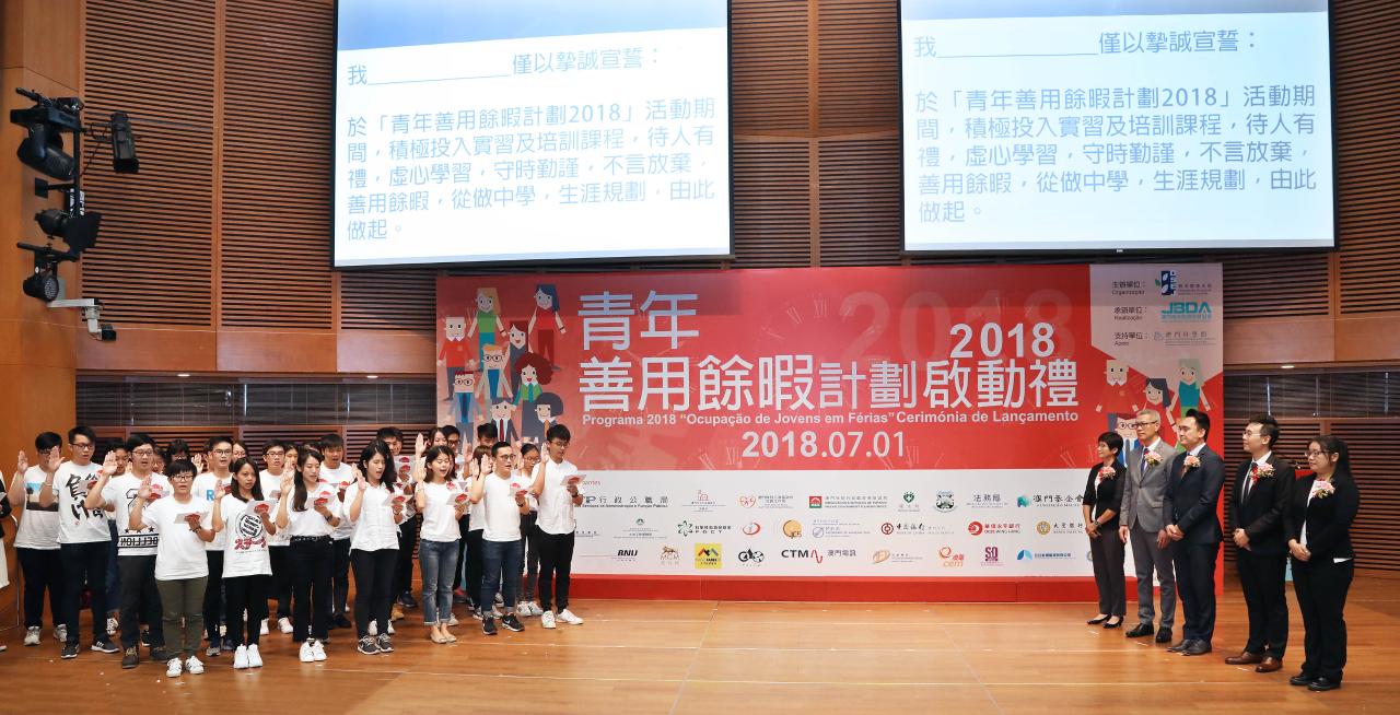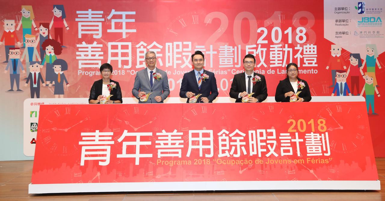 Realizou-se, com sucesso, a cerimónia de lançamento do programa “Ocupação de Jovens em Férias 2018”, no dia 1 de Julho (domingo), pelas 15h00, no Centro de Convenções do Centro de Ciência de Macau. O programa, organizado pela Direcção dos Serviços de Educação e Juventude (DSEJ) e executado pela Macau Junior Business Trade Development Association, conta ainda com o apoio do Centro de Ciência de Macau, S.A. e a participação e promoção conjunta de diversos serviços públicos e instituições particulares de Macau.