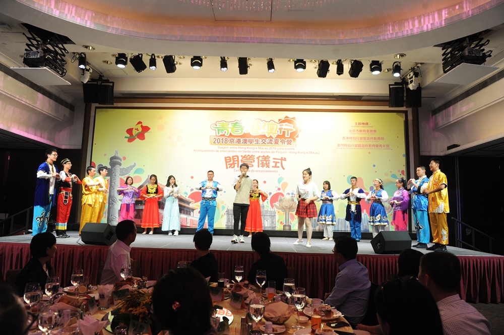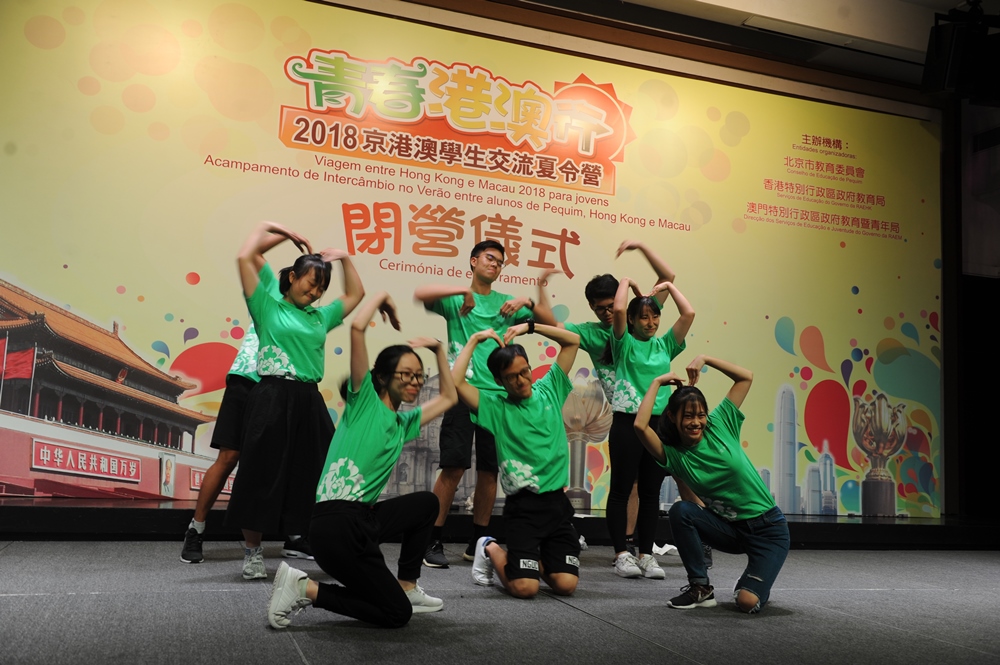 A cerimónia de encerramento do acampamento realizou-se no dia 30 de Julho no Centro de Convenções e Entretenimento da Torre de Macau e contou com a presença dos seguintes convidados: a Directora Substituta da DSEJ, Leong Vai Kei, o membro do Conselho de Educação de Pequim, Wang Dingdong, a Directora Principal de Educação dos Serviços de Educação da RAEHK, Lau Kar Shin, a adjunta do Chefe de Divisão do Departamento de Educação e Assuntos de Juventude do Gabinete de Ligação do Governo Popular Central na RAEM, Qu Xiaoyan, a Directora do Gabinete do Reitor da Universidade de Macau, Wong Kei, etc. Os representantes dos alunos das três regiões referiram, no seu discurso, na cerimónia de encerramento, que durante a participação neste acampamento tiveram a oportunidade de realizar um intercâmbio com alunos de outras regiões, partilharam as suas experiências de vida e atitude de aprendizagem, deram a conhecer diferentes modos de vida e afirmaram que aprenderam muito e que o acampamento lhes deixou impressões profundas e inesquecíveis, ampliaram os seus horizontes, aprofundaram o conhecimento sobre a cultura das três regiões, assim como estabeleceram laços de amizade profundos. Para além disso, os alunos das três regiões apresentaram exibição teatral, canção, leque de Tai Chi e dança, etc., em conjunto, demonstrando os seus talentos e representando diferentes características culturais. Por fim, os docentes e alunos de Pequim, Hong Kong e Macau participaram numa exibição de dança e o acampamento terminou com grande sucesso.
