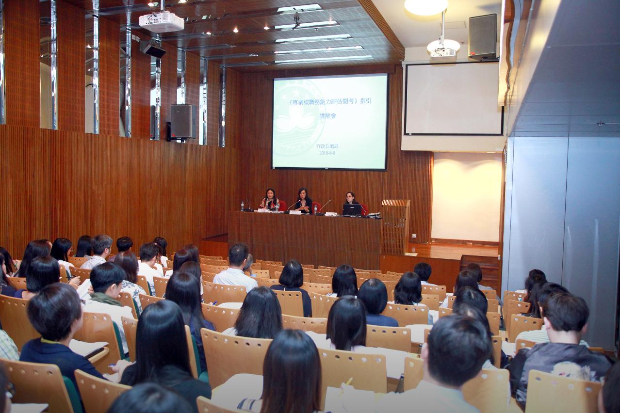 A sessão de esclarecimento sobre as orientações foi presidida pela Subdirectora do SAFP, Joana Maria Noronha, pela Chefe do Departamento de Planeamento e Recrutamento dos Trabalhadores dos Serviços Públicos, Fong Fong Tan e pela Chefe da Divisão de Recrutamento e Selecção de Pessoal, Chang Lei Lei, tendo as orientações sobre o concurso de avaliação de competências profissionais ou funcionais sido explicadas detalhadamente e as questões levantadas pelos participantes respondidas.