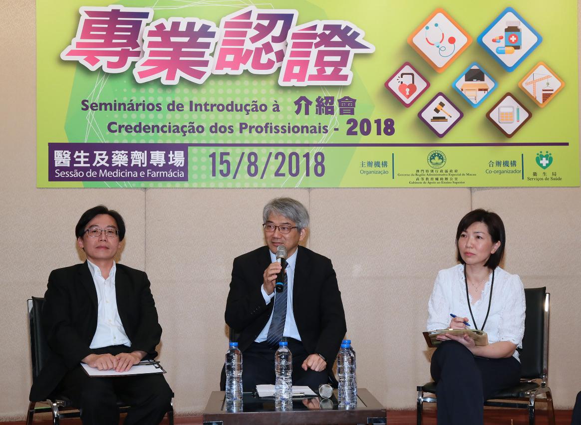 Organizado pelo Gabinete de Apoio ao Ensino Superior e co-organizado pelos Serviços de Saúde, o “Seminário de Introdução à Credenciação dos Profissionais - 2018 - Sessão de Medicina e Farmácia” foi realizado no Centro de Saúde da Areia Preta em 15 de Agosto, onde estiveram presentes cerca de 130 estudantes universitários. Participaram também na iniciativa o Director dos Serviços de Saúde, Dr. Lei Chin Ion, o Chefe do Departamento de Assuntos Farmacêuticos, Choi Peng Cheong, a Responsável da Unidade Técnica de Licenciamento das Actividades e Profissões Privadas de Prestação de Cuidados de Saúde, Leong Pui San, o Coordenador Substituto do Gabinete de Apoio ao Ensino Superior, Chang Kun Hong, e o Vice-Coordenador Substituto, Chan Ka Hou.