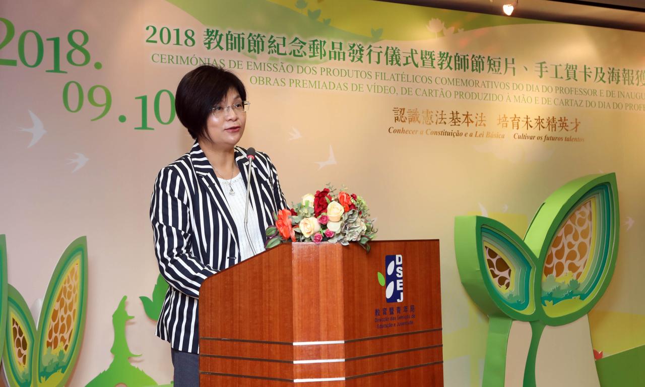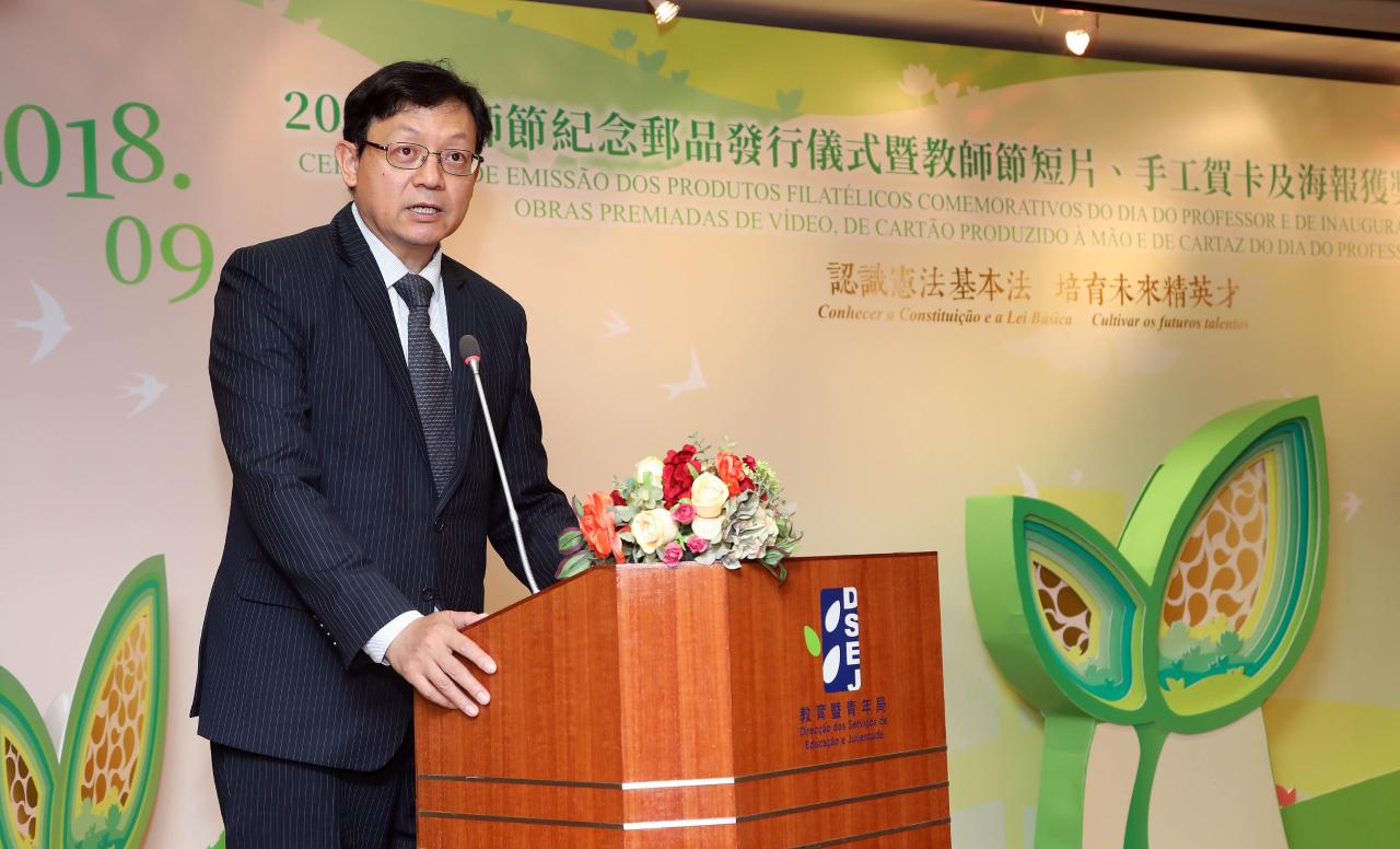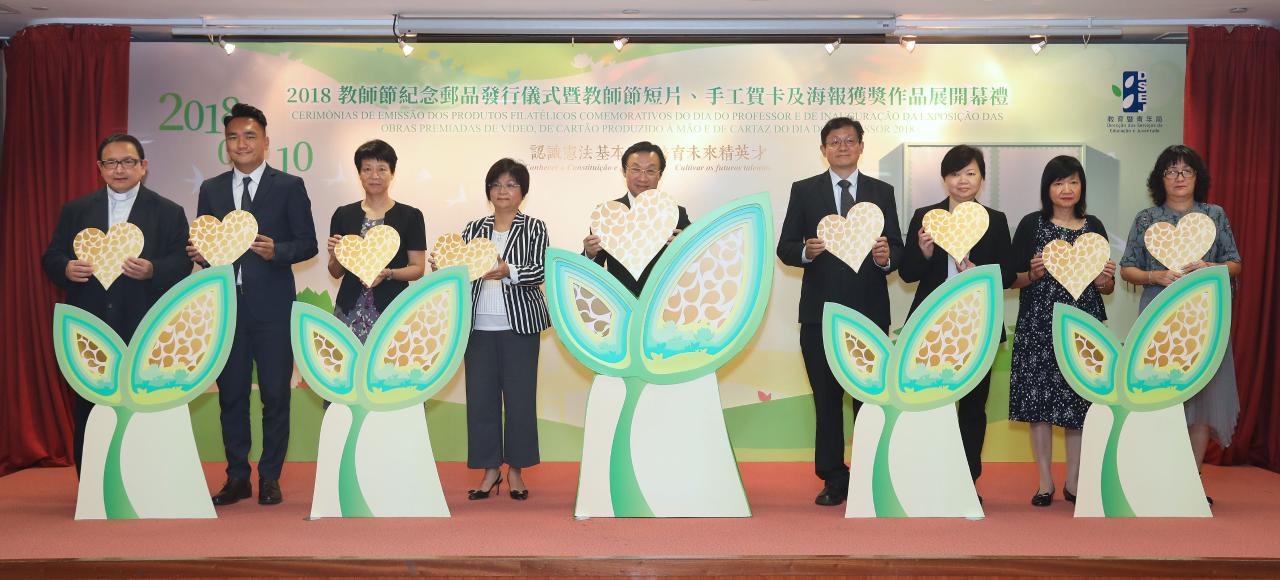 A Direcção dos Serviços de Educação e Juventude (DSEJ) e a Direcção dos Serviços de Correios e Telecomunicações colaboraram, continuamente, este ano, na emissão de produtos filatélicos comemorativos do Dia do Professor, tendo organizado, ainda, um concurso de design de vídeo, de cartão produzido à mão e de cartaz do Dia do Professor, como iniciativas importantes para celebrar este dia. Assim, na manhã do dia 10 de Setembro realizou-se, no Salão de Conferências Confúcio da DSEJ, a Cerimónia de Emissão dos Produtos Filatélicos Comemorativos 2018 e, depois, na Galeria Zizhan do Centro de Recursos Educativos (CRE), a Cerimónia de Inauguração da Exposição das Obras Premiadas de Design de Vídeo, de Cartão Produzido à Mão e de Cartaz do Dia do Professor 2018. As cerimónias contaram com a presença dos seguintes convidados: Alexis, Tam Chon Weng, Secretário para os Assuntos Sociais e Cultura, Lou Pak Sang, director da DSEJ, Lau Wai Meng, directora da Direcção dos Serviços de Correios e Telecomunicações, Xu Ting, chefe do Departamento de Educação e Assuntos de Juventude do Gabinete de Ligação do Governo Popular Central na RAEM, Leong Vai Kei e Kong Chi Meng, subdirectores da DSEJ, Ho Sio Kam, presidente da Associação de Educação de Macau, Chow Pak Fai, presidente da Associação das Escolas Católicas de Macau, Lo Yuk Ling, vice-presidente da Assembleia Geral da Associação Educativa da Função Pública de Macau, Chan Kai Chon, director do Museu de Arte de Macau, membros do Fundo de Desenvolvimento Educativo, do Conselho de Educação para o Ensino Não Superior, do Conselho de Juventude, do Conselho Profissional do Pessoal Docente e do Grupo Coordenador e Consultivo dos Trabalhos dos Cursos de Formação do Pessoal Docente, Professores Distintos do ano escolar de 2016/2017 e representantes das escolas, entre outros.