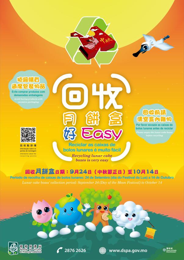 Tendo como objectivo impulsionar uma melhor redução de resíduos e a recolha de resíduos recicláveis, a Direcção dos Serviços de Protecção Ambiental (DSPA), estreia, este ano, a campanha “Reciclar as caixas de bolo lunar é muito fácil”, que conta com a cooperação dos serviços governamentais, associações, hotéis, bancos, instituições do ensino superior e escolas, edifícios residenciais, entre outros relacionados. Foram instalados mais de 800 pontos de recolha das caixas de bolo lunar em diversas zonas de Macau, para incentivar a população a colectar as respectivas caixas usadas no prazo estabelecido para a sua recolha (compreendido entre o dia 24 de Setembro e 14 de Outubro deste ano). As informações pormenorizadas podem ser consultadas na página electrónica da DSPA(http://www.dspa.gov.mo/lunarcakeboxrecycling.aspx) ou digitalizar o Código QR relevante. Esta Direcção irá, após a conclusão desta campanha, destacar pessoal para recolher os respectivos recipientes para serem reciclados posteriormente.