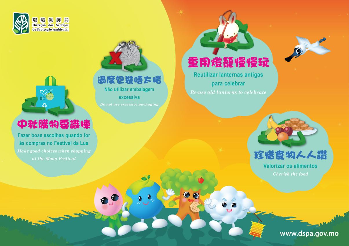 Nas vésperas do Festival da Lua, a DSPA apela à população para cumprir a redução de resíduos a partir da fonte, celebrando-se as festividades alegremente: dever optar-se por embalagens de menor volume aquando da aquisição de produtos para passar o dia festivo; sempre que possível, evitar o uso de embalagens desnecessárias; ter sempre em mente a cultura da valorização dos alimentos e não desperdiçar alimentos; guardar bem as lanternas depois da passagem do referido Festival para serem usadas no próximo ano; reutilizar, tanto quanto possível, caixas de bolo lunar que se encontram ainda em bom estado, em conformidade com o princípio de reutilizar primeiro, reciclar depois.