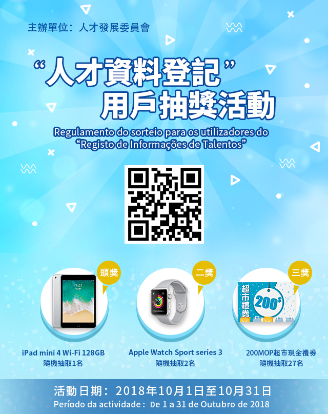 Com o objectivo de motivar mais residentes de Macau a fazerem o registo ou a actualizarem os seus dados, para aperfeiçoar a base de dados de talentos, a Comissão de Desenvolvimento de Talentos vai realizar um sorteio entre 1 e 31 de Outubro. Os residentes de Macau que tenham completado 15 anos de idade, e que acedam ao sistema de “Registo de Dados de Quadros Qualificados”, durante aquele mês, e preencham as informações (novo registo) ou actualizem (registo antigo) os dados pessoais ou as habilitações académicas, estão automaticamente inscritos no sorteio a realizar por esta Comissão, desta forma, os dados inseridos servirão para aperfeiçoar, no futuro, a base de dados de talentos e para referência no âmbito da elaboração das políticas.