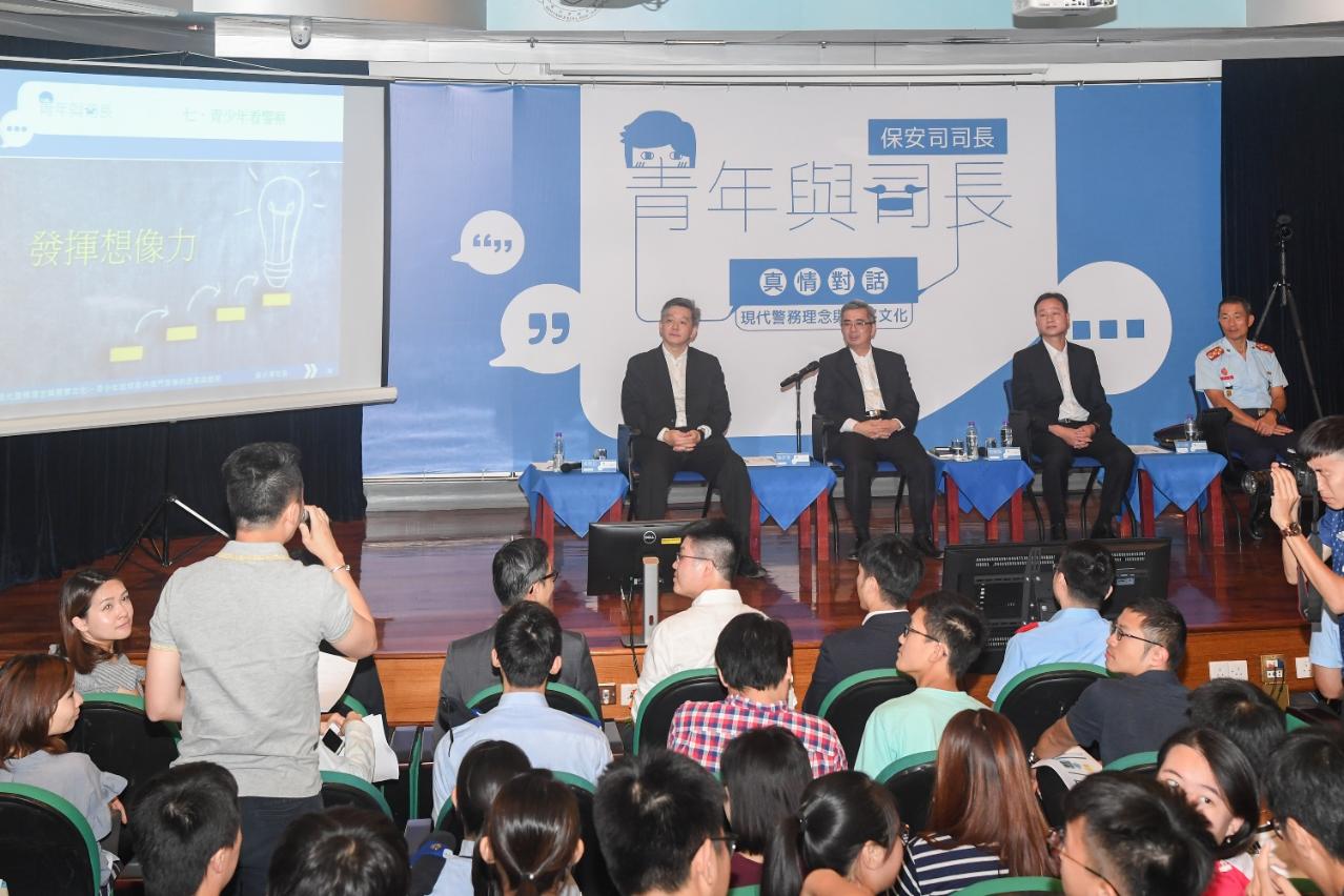 A mesma actividade teve lugar na Escola Superior das Forças de Segurança de Macau (ESFSM), em Coloane. Na mesma ocasião, o Secretário para a Segurança, Wong Sio Chak, o Comandante-geral dos Serviços de Polícia Unitários, Ma Io Kun, o Director-geral dos Serviços de Alfândega, Vong Iao Lek, o Director da ESFSM, Hoi Sio Iong e outros dirigentes das forças e serviços de segurança trocaram impressões com mais de 160 representantes provenientes de 17 associações e organizações juvenis sobre o tema de “conceito de policiamento moderno e cultura policial” e as matérias que os jovens prestam com mais atenção. O Secretário Wong efectuou, de forma aprofunda e compreensível, a apresentação sobre o conceito de policiamento moderno e cultura policial, a conexão interna entre o conceito de policiamento moderno e cultura policial; referindo ainda que os trabalhos da prevenção e combate aos crimes, da fiscalização de segurança e do controlo de ordem efectuados nos termos da lei não devem ficar apenas na prestação de importância ao reforço da consciência de segurança dos cidadãos e do nível cívico e moral, pelo que as autoridades de segurança, de um ponto de vista mais prospectiva, prestam ainda atenção elevada, consideração total eacompanhamento activa a deliquência juvenil e as questões relacionadas com jovens.
