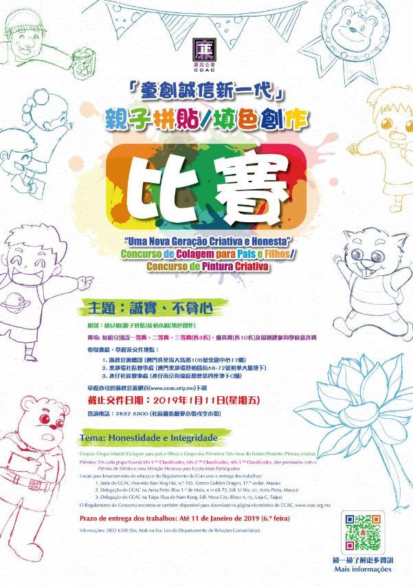 No intuito de incentivar as crianças e seus encarregados de educação a reflectir sobre a importância da honestidade e integridade para cada um e para a sociedade através da produção de obras de artes visuais e da interação entre pais e filhos, o Comissariado contra a Corrupção (CCAC) organiza a actividade “Uma Nova Geração Criativa e Honesta” Concurso de Colagem para Pais e Filhos/Concurso de Pintura Criativa, aberta à participação de estudantes dos jardins de infância e dos primeiros três anos do ensino primário de Macau.