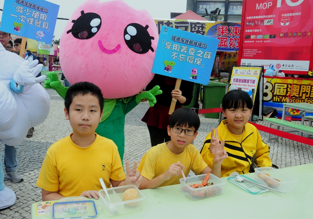 A Direcção dos Serviços de Protecção Ambiental organizou a actividade “As Mascotes da DSPA acompanham-te durante o Festival de Gastronomia”, na qual participaram mais de 40 docentes, alunos e seus pais, permitindo a redução de produção de resíduos.