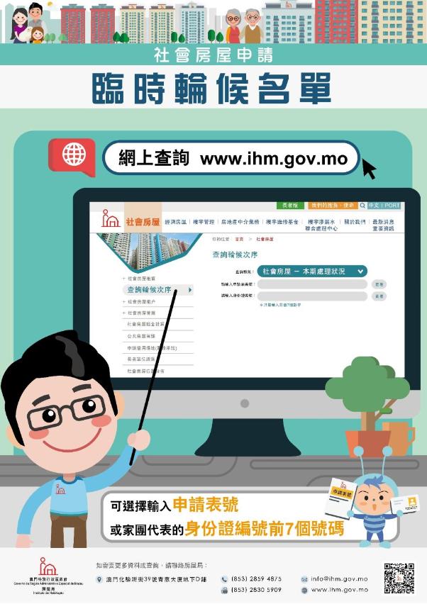 Os candidatos ainda conseguem consultar através da página electrónica do IH (www.ihm.gov.mo), na coluna de Consulta a ordenação da habitação social, podendo escolher através da inserção do número do boletim de candidatura ou do primeiro sete números do bilhete de identidade do representante do agregado familiar, para consultar a ordenação da candidatura ou o motivo da exclusão.