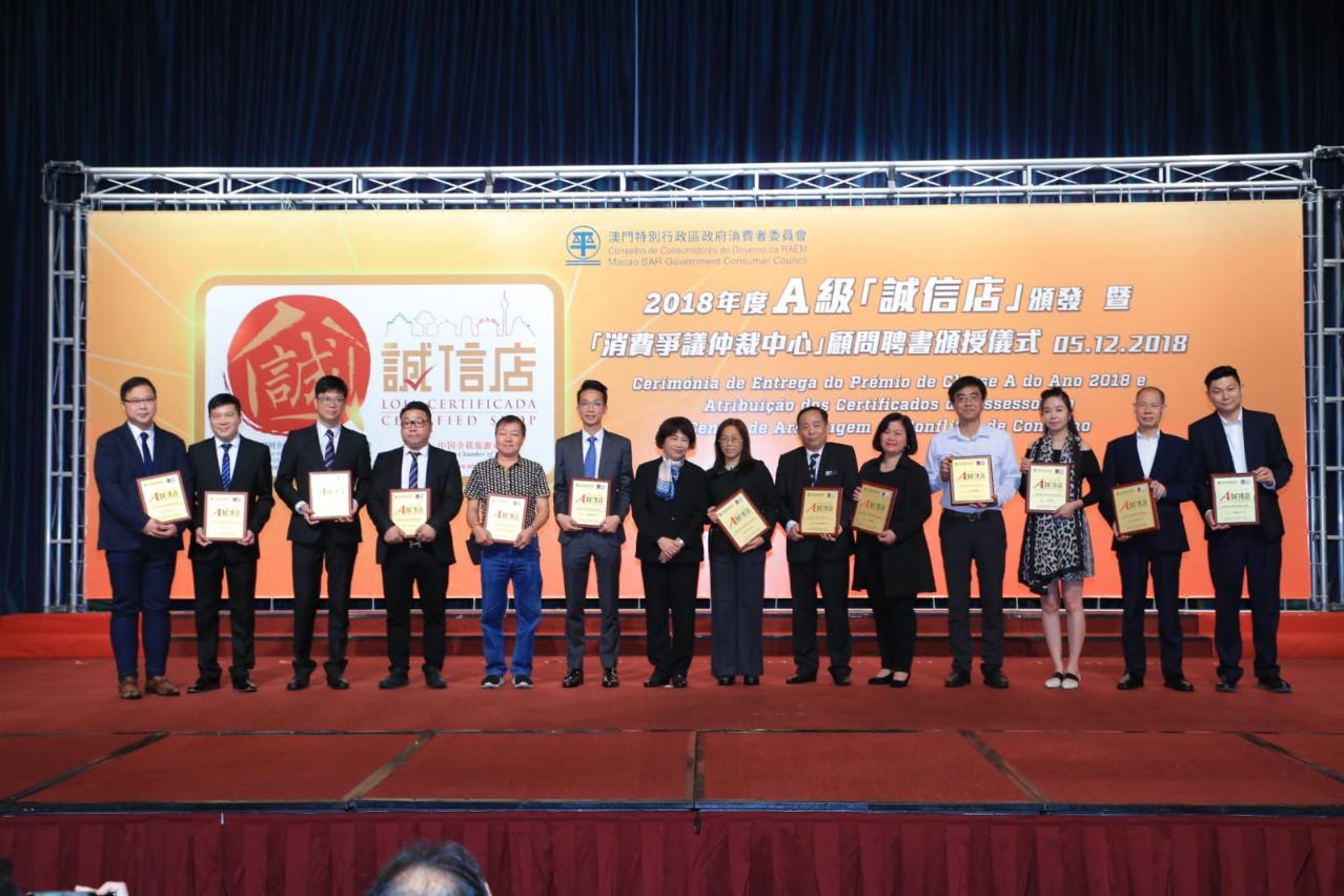 O Conselho de Consumidores (CC) divulgou hoje os resultados da avaliação de Lojas Certificadas, segundo os quais, 1040 estabelecimentos comerciais foram qualificados como Lojas Certificadas para o ano de 2019. Mais de 800 estabelecementos obtiveram uma classificação de A, A- e B na avaliação, sendo de destacar que 13 estabelecimentos foram classificados como Lojas Certificadas de Classe A por ter alcançado a menção A (Excelente). Nesse sentido, o CC realizou a cerimónia de entrega do prémio de classe A no dia 5 de Dezembro, no sentido de incentivar todos os estabelecimentos comerciais aderentes do Sistema do Símbolo de Qualidade de Loja Certificada a persistir em explorar actividades com práticas comerciais leais e contribuindo assim para a criação de um ambiente de consumo mais confiável, mais seguro e de melhor qualidade.