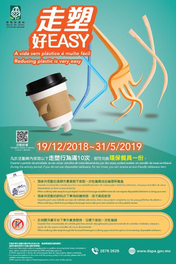 Tendo como objectivo impulsionar a redução do uso de utensílios de mesa descartáveis por parte da população, e para alcançar a redução de resíduos a partir da fonte, a Direcção dos Serviços de Protecção Ambiental (DSPA) lançou uma actividade intitulada “A vida sem plástico é muito fácil”, com a cooperação de associações, operadoras de aplicações de encomenda de comidas e bebidas (incluindo cerca de 1.300 estabelecimentos de restauração e bebidas e lojas de bebidas locais das aplicações), bem como mais de 150 estabelecimentos de restauração e bebidas e lojas de bebidas locais, visando estimular a população a não pedir, por sua iniciativa, utensílios de mesa descartáveis quando comprar comida para o exterior. Poderá ser trocado por um pacote de utensílios de mesa ambientalmente ecológicos logo que o acto de não consumo de plástico tenha completado, cumulativamente, dez vezes.
