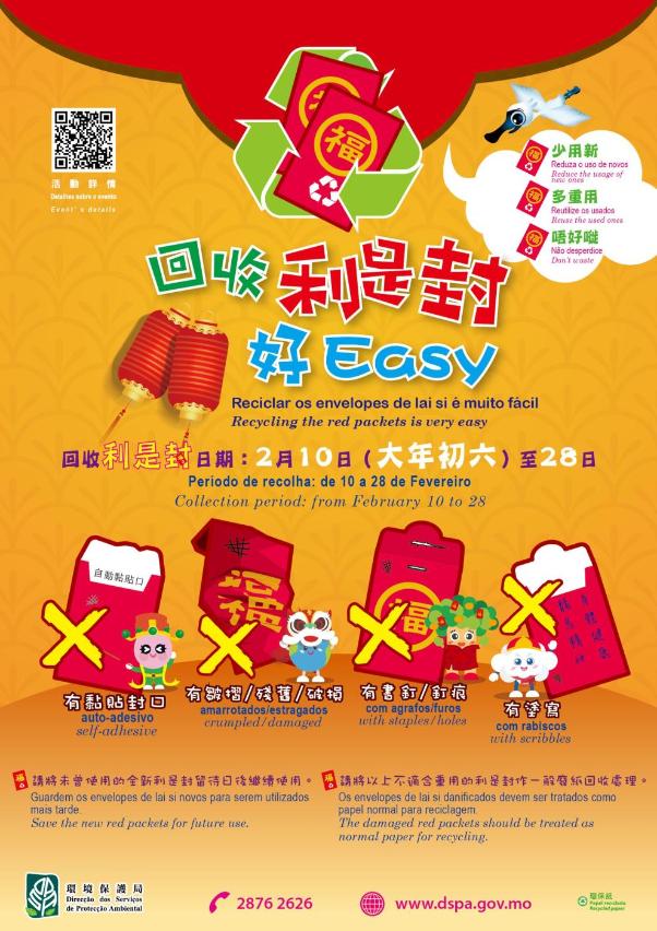 A Direcção dos Serviços de Protecção Ambiental (DSPA) vai continuar a realizar a iniciativa “Reciclar os envelopes de lai si é muito fácil” na altura do Ano Novo Chinês. Há mais de 800 postos de recolha espalhados pelas diversas zonas de Macau, através da cooperação com os serviços públicos, associações, escolas, bancos, supermercados, edifícios habitacionais, empresas de jogos e hotéis (no total, cerca de 300 instituições e entidades), recolhendo os envelopes de lai si a partir de hoje (10 de Fevereiro) e até 28 de Fevereiro, o que permite a participação dos cidadãos na reciclagem de recursos e na poupança de papel, para passarmos todos um Ano Novo Chinês amigo do ambiente. Apelamos a todos, o favor, de manter os envelopes de lai si limpos e completos, sendo os envelopes de lai si auto-colantes, ou com grampo metálico/ furos feitos por agrafador, rabiscos, dobrados, obsoletos ou estragados, entre outros não reutilizáveis, tratados como papéis normais para reciclagem. Para além disso, com o objectivo de concretizar a redução da produção de resíduos, várias instituições cooperantes instalaram as suas próprias caixas de recolha de materiais existentes, sendo os locais onde essas caixas são colocadas também diferentes, porque são diferentes os dispositivos e os estabelecimentos onde são colocadas, pelo que deve ser perguntado ao pessoal de atendimento das respectivas instituições quando for necessário.